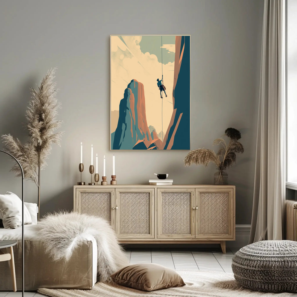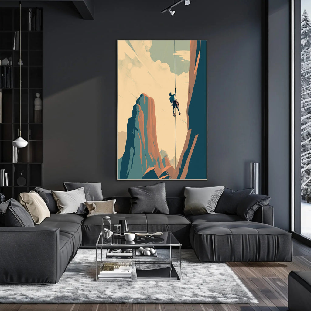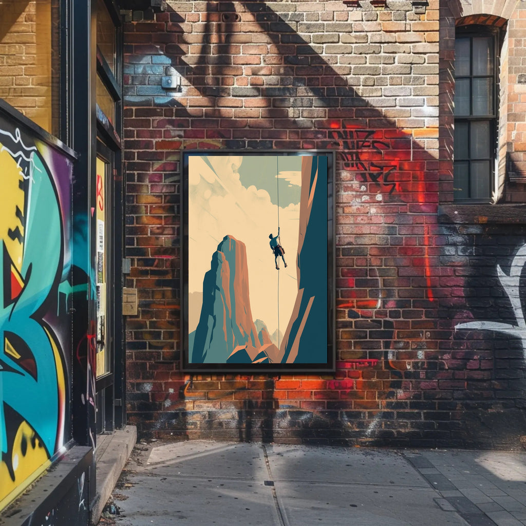 This climbing poster blends exploration theme and rugged landscape motifs into a modern print that works equally well as inspiring decor or a focal point in a nature lover’s gallery wall. The limited color palette and dynamic vertical layout make it especially effective in narrow or tall frames, drawing the eye upward with the climber's ascent.