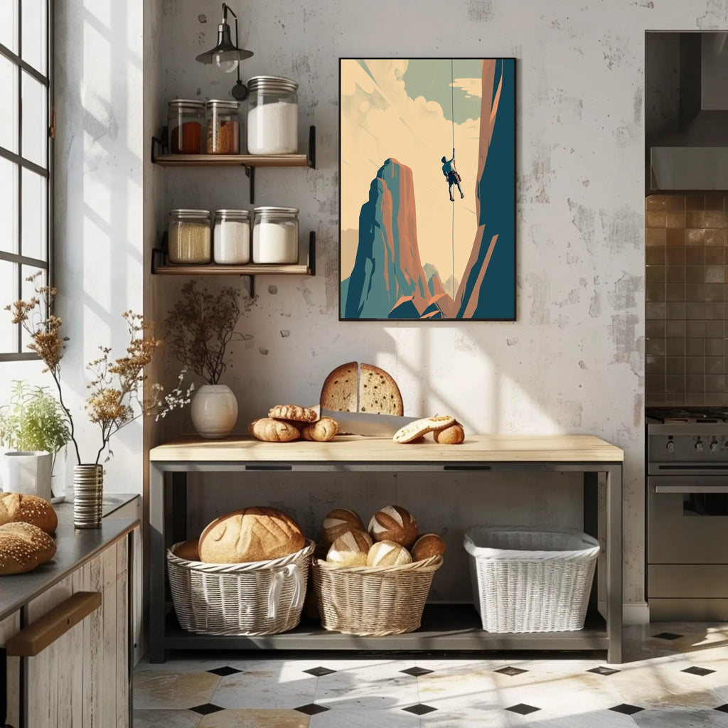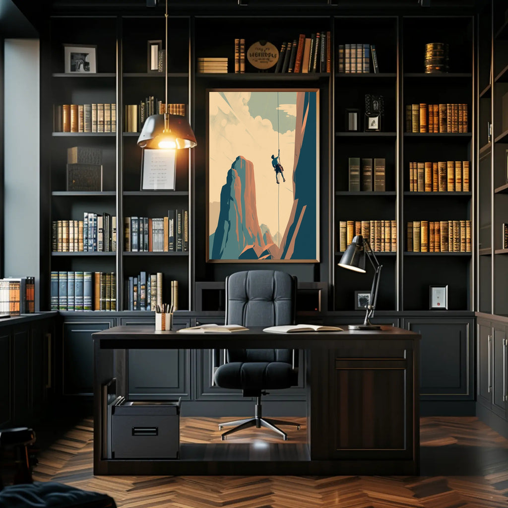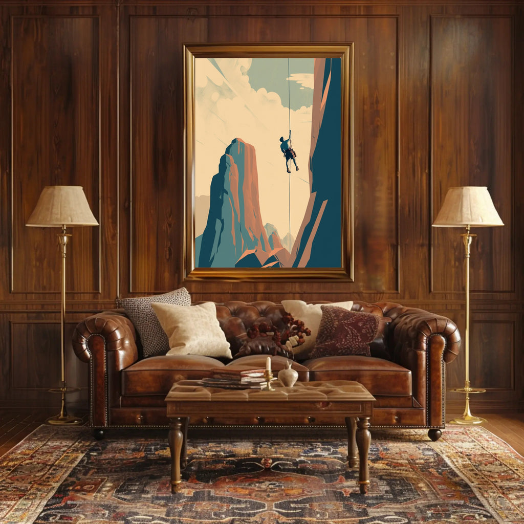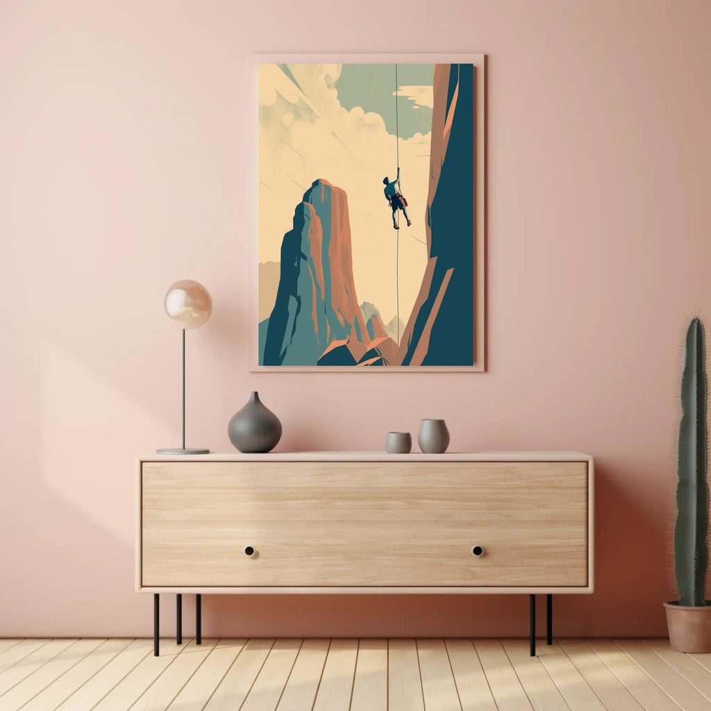 This climbing poster blends exploration theme and rugged landscape motifs into a modern print that works equally well as inspiring decor or a focal point in a nature lover’s gallery wall. The limited color palette and dynamic vertical layout make it especially effective in narrow or tall frames, drawing the eye upward with the climber's ascent.