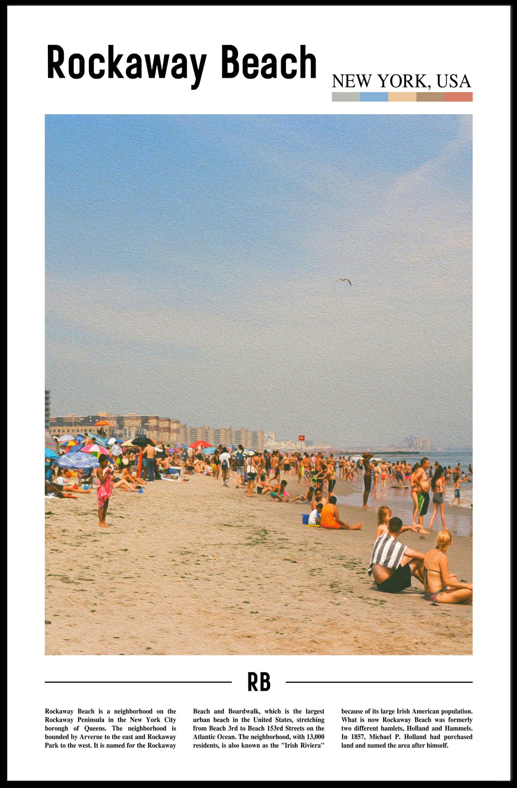 Capture the energy of a sun-drenched New York summer with the Rockaway Beach Summer Scene Modern Travel Poster from PosterGoat. This vibrant, mid-century–inspired print transforms a crowded seaside snapshot into a stylish pop-art poster that brings beach vibes and urban travel nostalgia to any room.