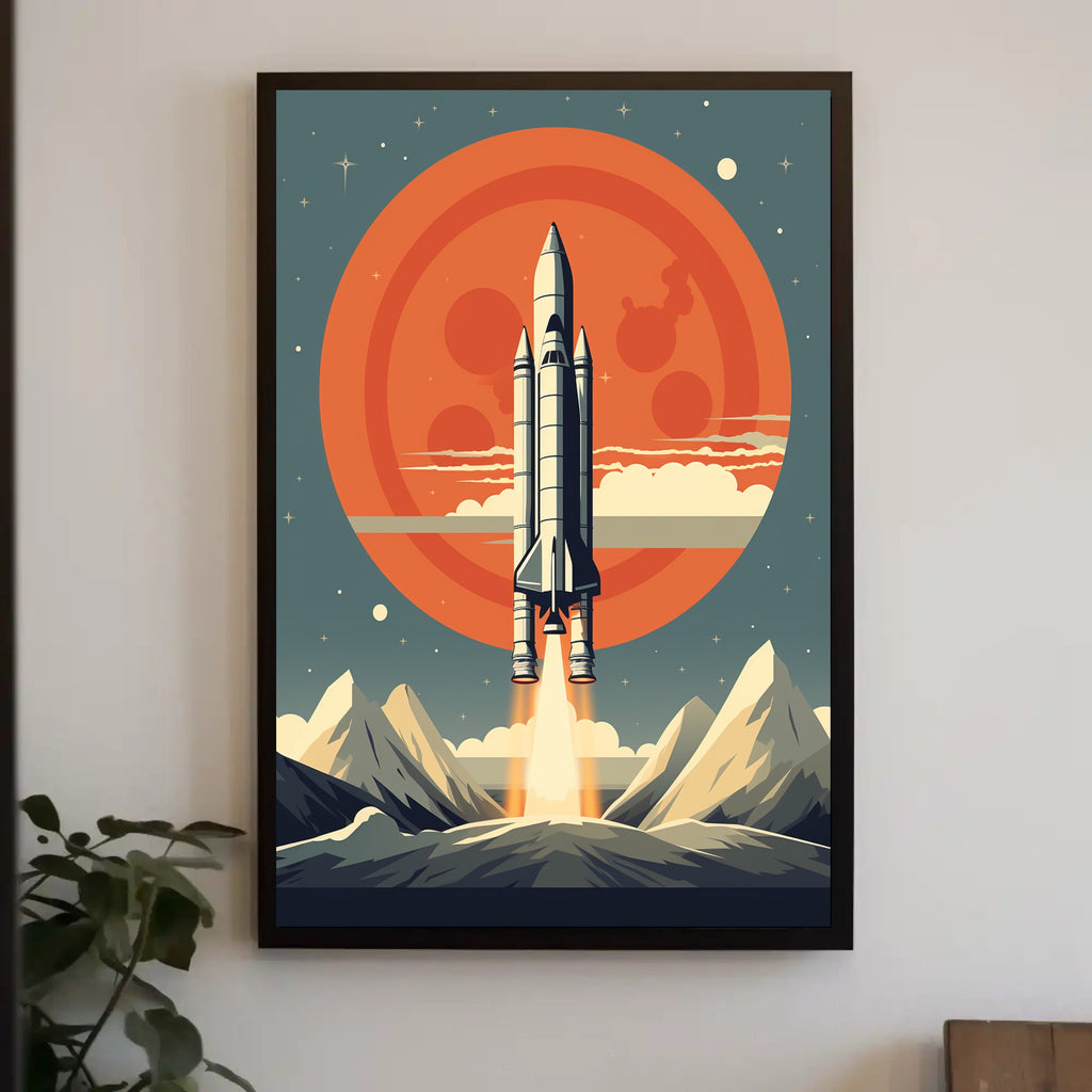 Capture the thrill of lift-off with the Rocket Launch Into The Cosmos Poster from PosterGoat — a striking, minimalist art print that fuses retro sci‑fi style with modern home decor. Bold geometric shapes, a warm orange planetary backdrop, and a sleek rocket rising above jagged mountain peaks create a cinematic focal point perfect for living rooms, offices, nurseries, or home galleries.