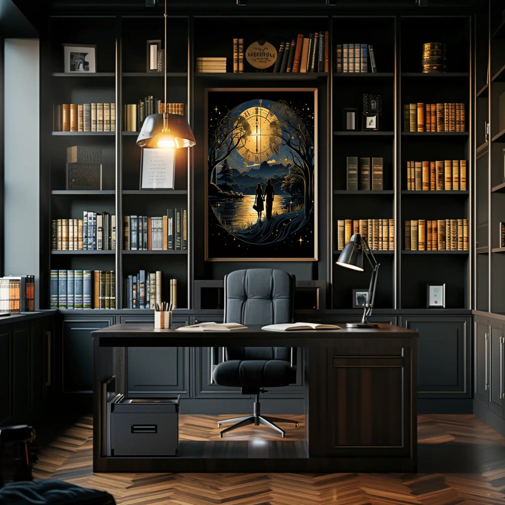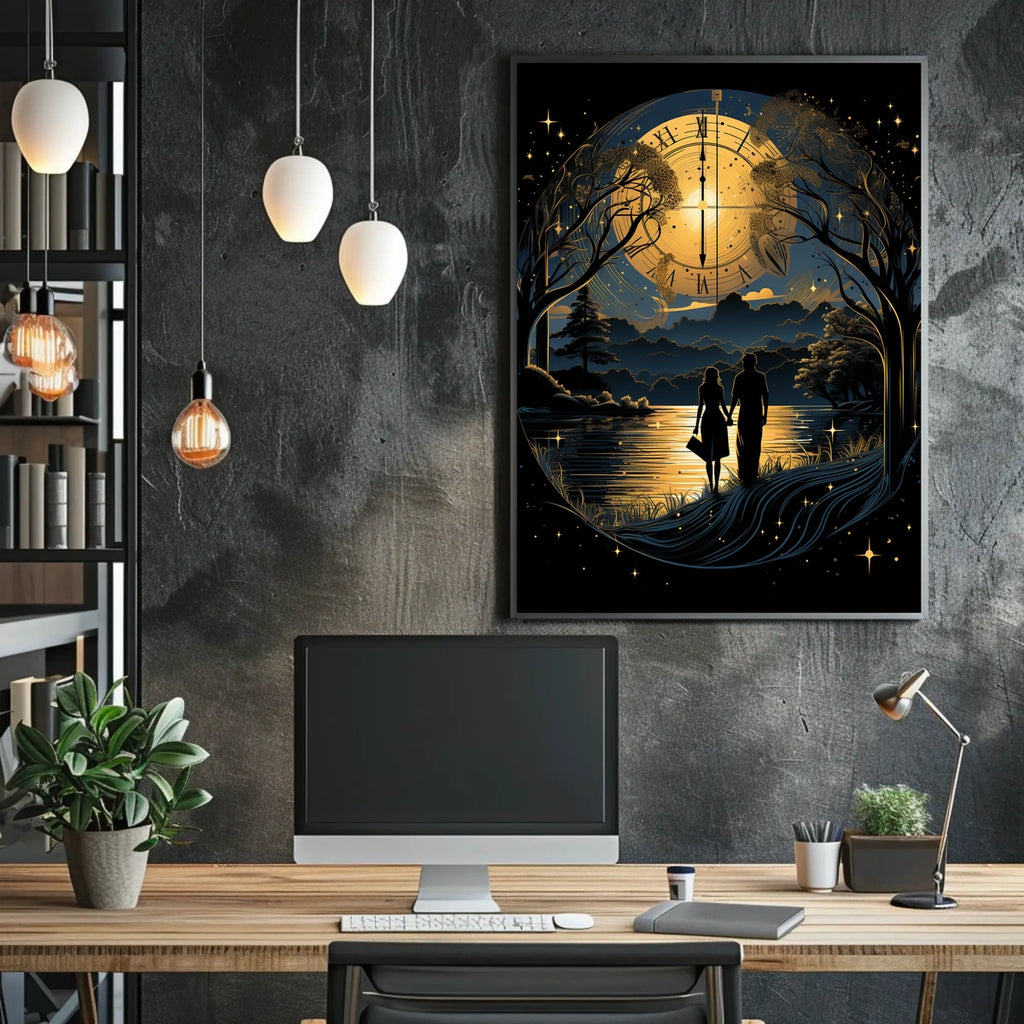 This enchanting poster captures a timeless romantic scene with a silhouetted couple walking hand in hand under a captivating night sky. The setting is a serene cosmic environment, accented by a celestial theme that features a large, artistic clock face serving as the moon, with swirling clock hands. The dreamlike atmosphere is enhanced by stars and cosmic elements, framed by two prominent trees. The surreal, illustrative style uses detailed linework in a limited palette of gold, blue, and black to create a mystical ambiance that whispers of time, love, and connection.