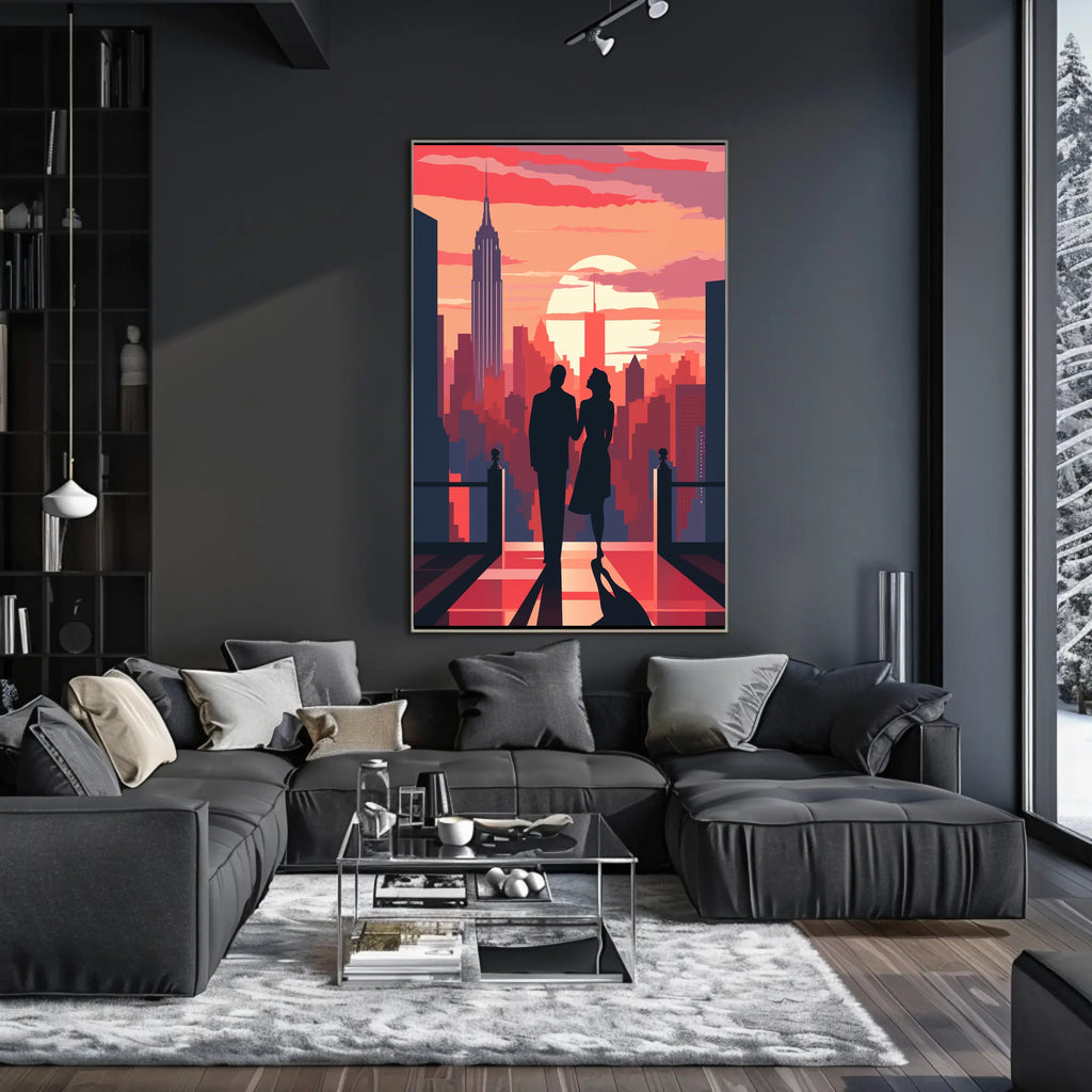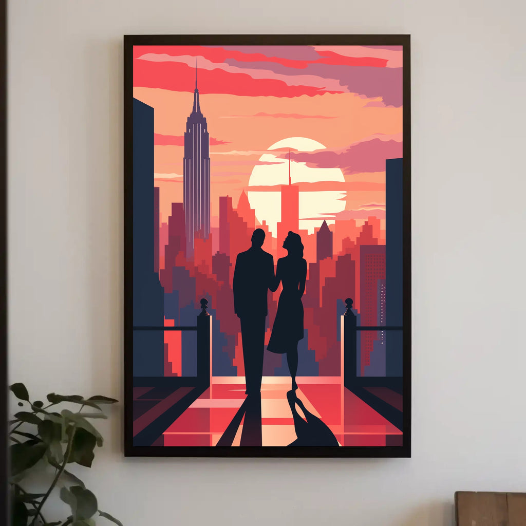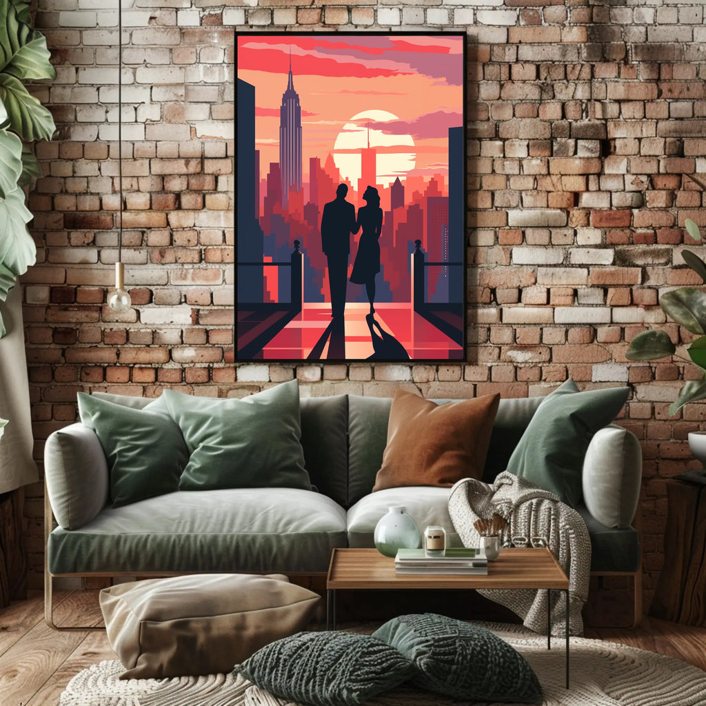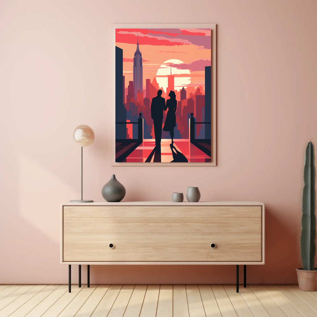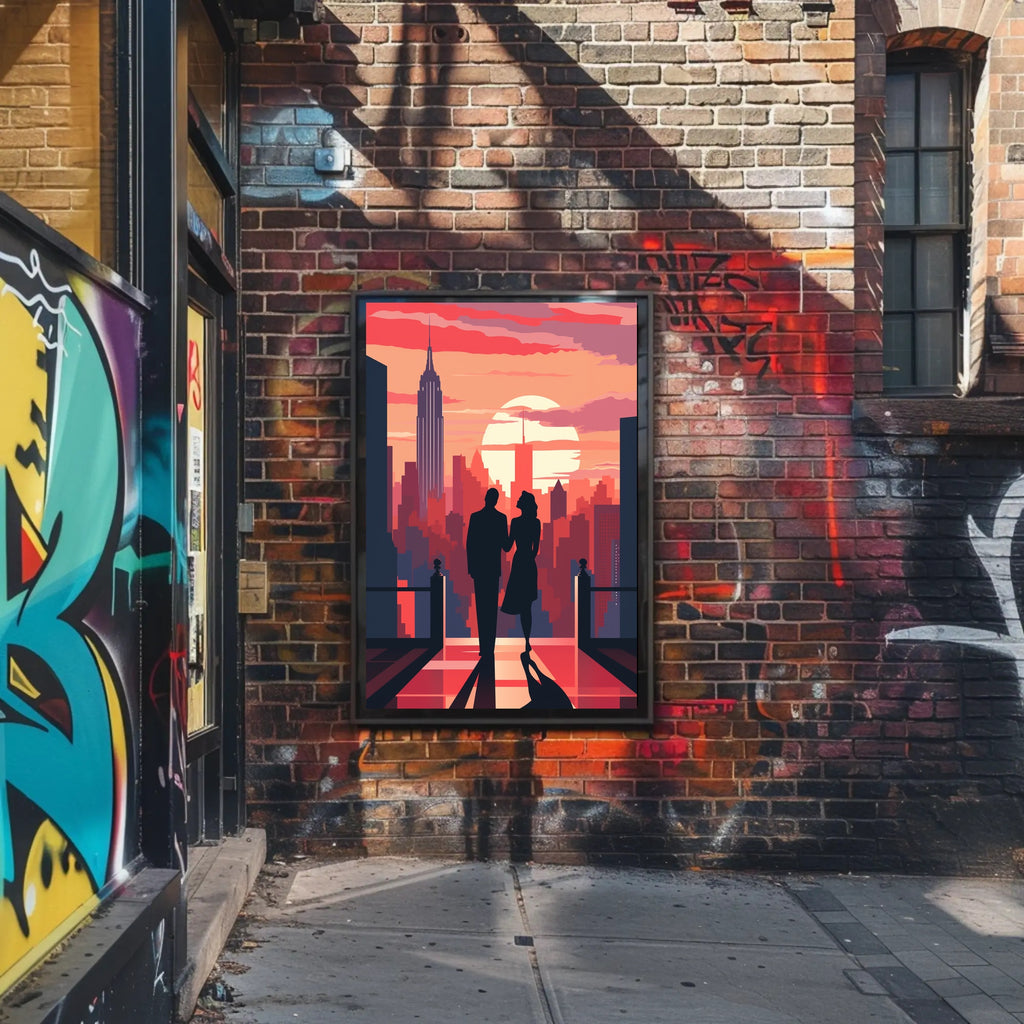 Elevate your space with the Romantic Skyline Silhouette: Classic NYC Art Poster from PosterGoat — a minimalist, modern poster that captures a timeless moment: a couple in silhouette strolling toward a glowing sunset over the New York City skyline. Bold warm tones and crisp graphic shapes create dramatic contrast that draws the eye and sets a romantic, cinematic mood.
