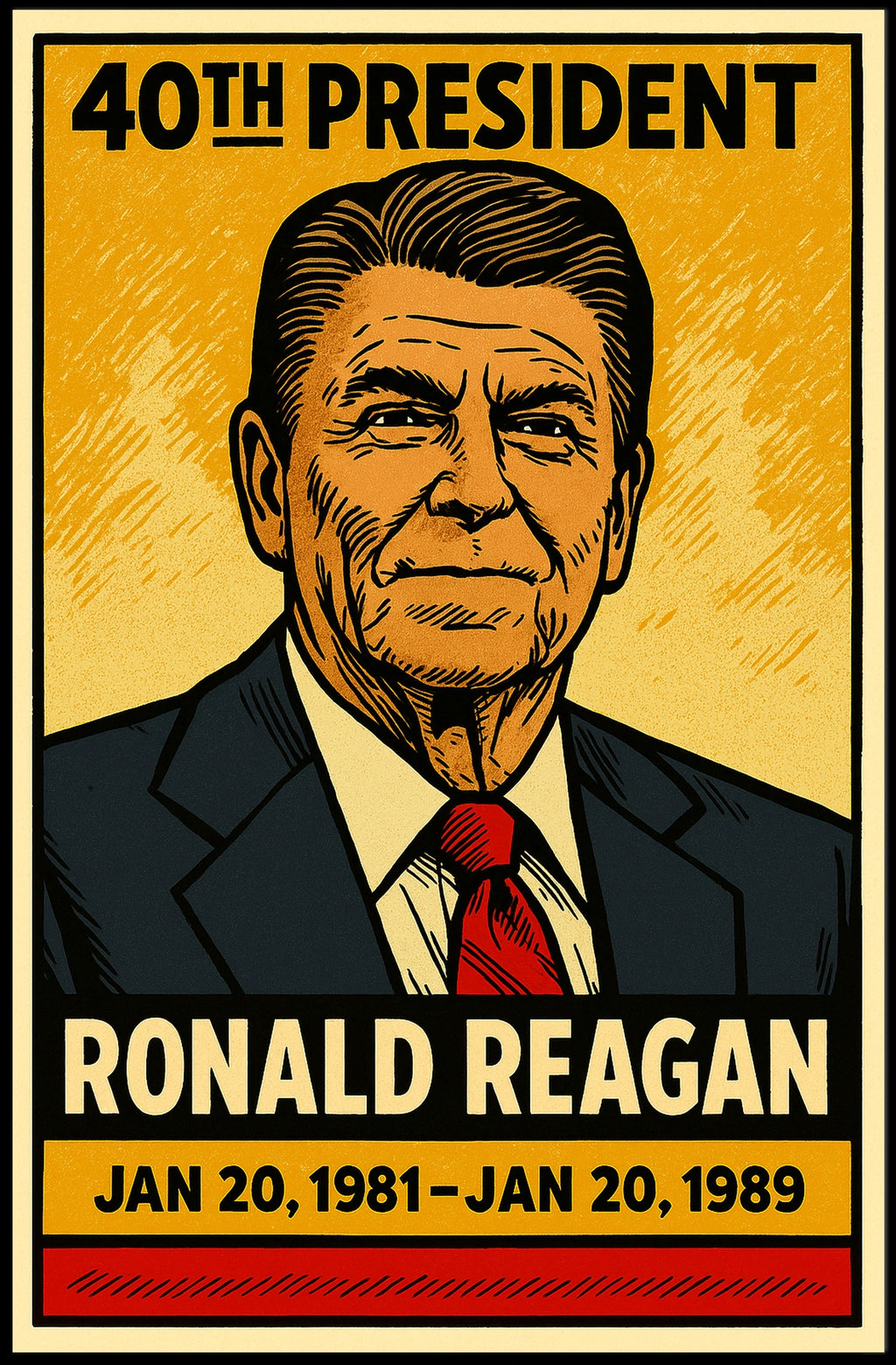 - Detailed design highlighting a dramatic inked comic-style portrait of Ronald Reagan