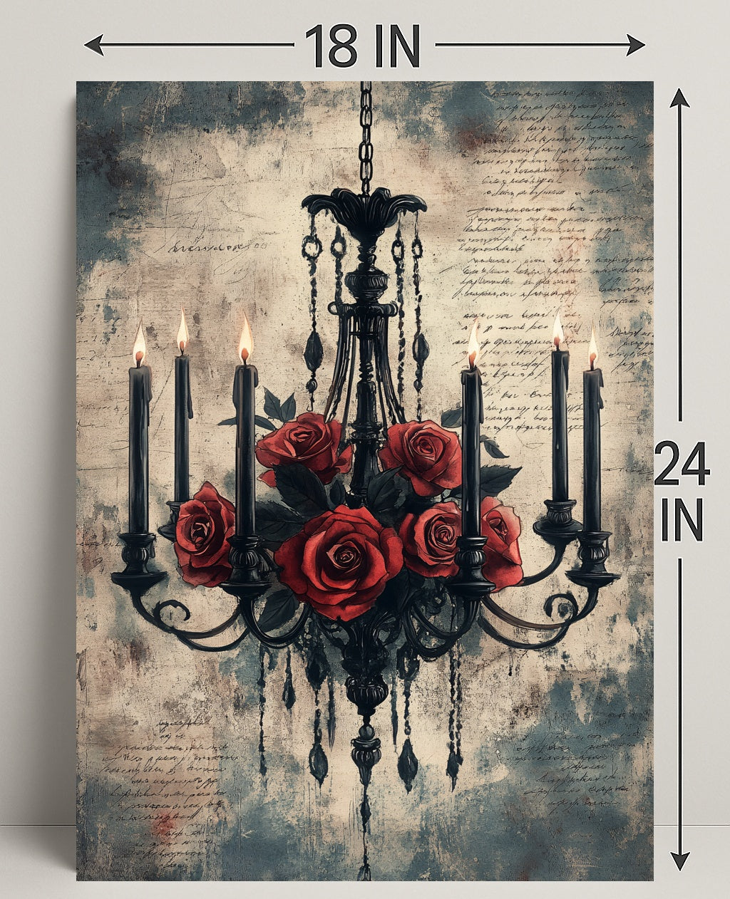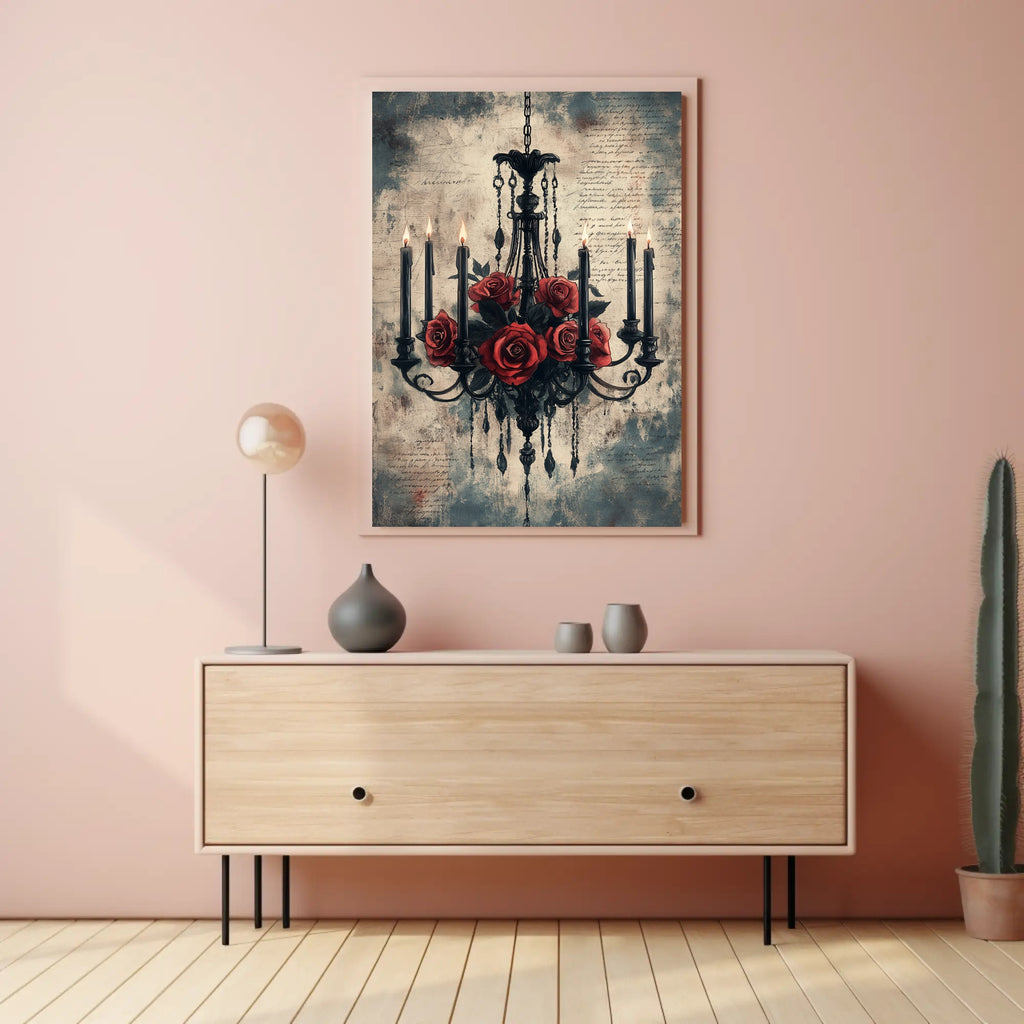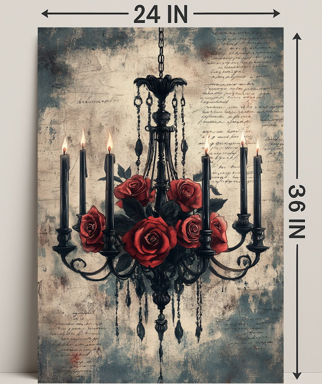 The print features a dramatic black chandelier entwined with lush red roses and slender black candles, set against a textured, distressed background with faded script and painterly blue-gray washes. Rich contrast and finely rendered detail make the roses pop while the candle flames lend a warm, atmospheric glow that draws the eye.