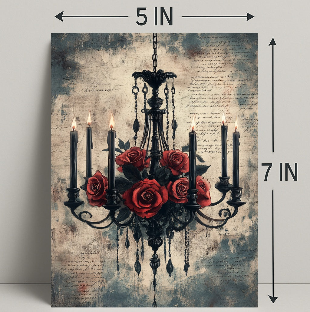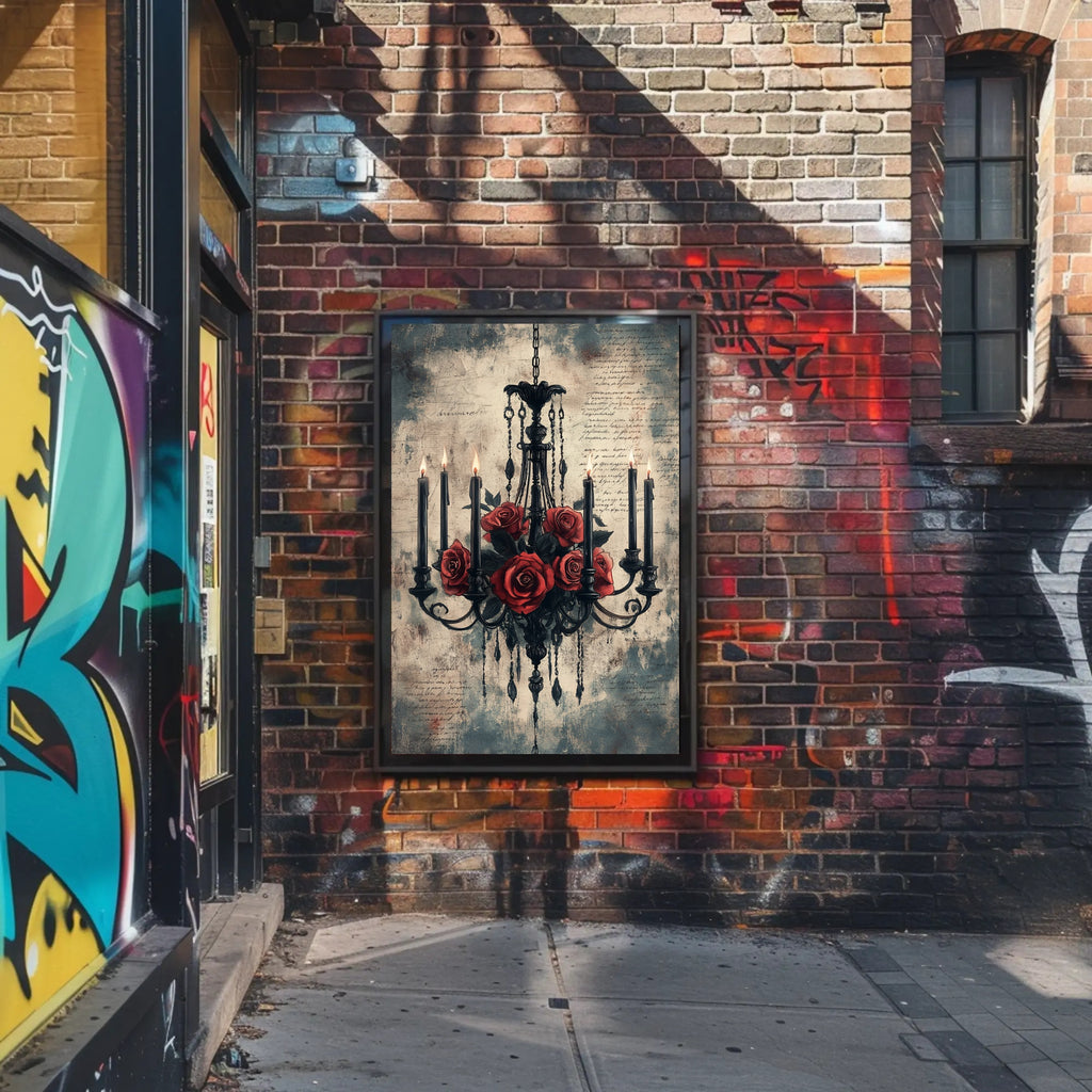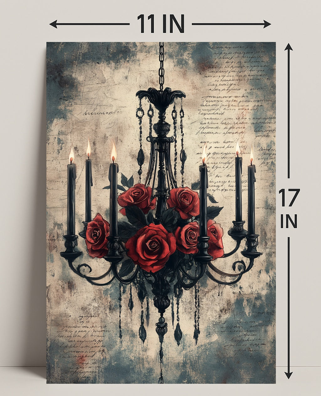 The print features a dramatic black chandelier entwined with lush red roses and slender black candles, set against a textured, distressed background with faded script and painterly blue-gray washes. Rich contrast and finely rendered detail make the roses pop while the candle flames lend a warm, atmospheric glow that draws the eye.