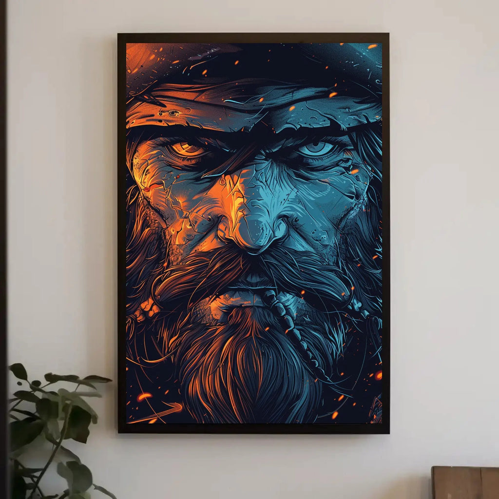 Rugged Bearded Man Intense Portrait — a striking artistic poster from PosterGoat that commands attention with its dramatic close-up, rich illustrative detail, and bold contrast of cool blues and warm oranges. This intense portrait blends pop-art edge with minimalist composition to create a powerful focal piece for any room in your home or office.