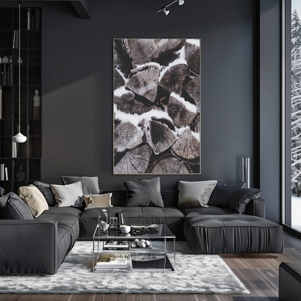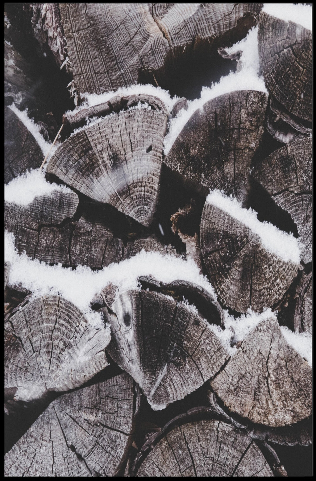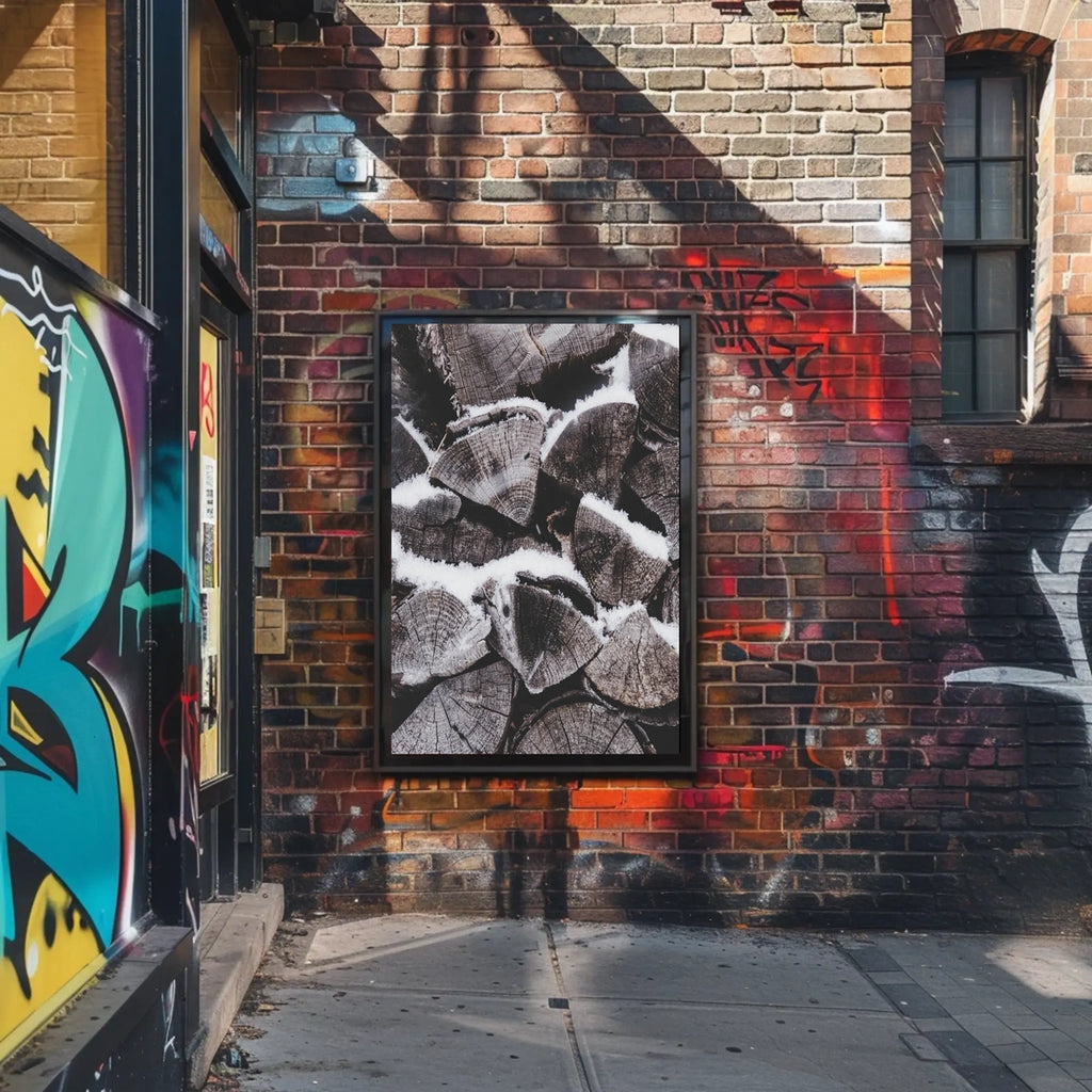 Rustic Winter Serenity Photorealistic Abstract or Artistic Poster captures the tranquil beauty of a rustic winter landscape. This poster features a photorealistic depiction of cut logs dusted with snow, where intricate wood grain patterns juxtapose the soft, bright snow to emphasize natural contrast. Set in a northern temperate region, the scene evokes a serene and cozy atmosphere, ideal for those who cherish nature and the outdoors. It stands as an artistic celebration of winter's charm and is a perfect choice for anyone who values sustainability themes and the simple joys of rustic living.