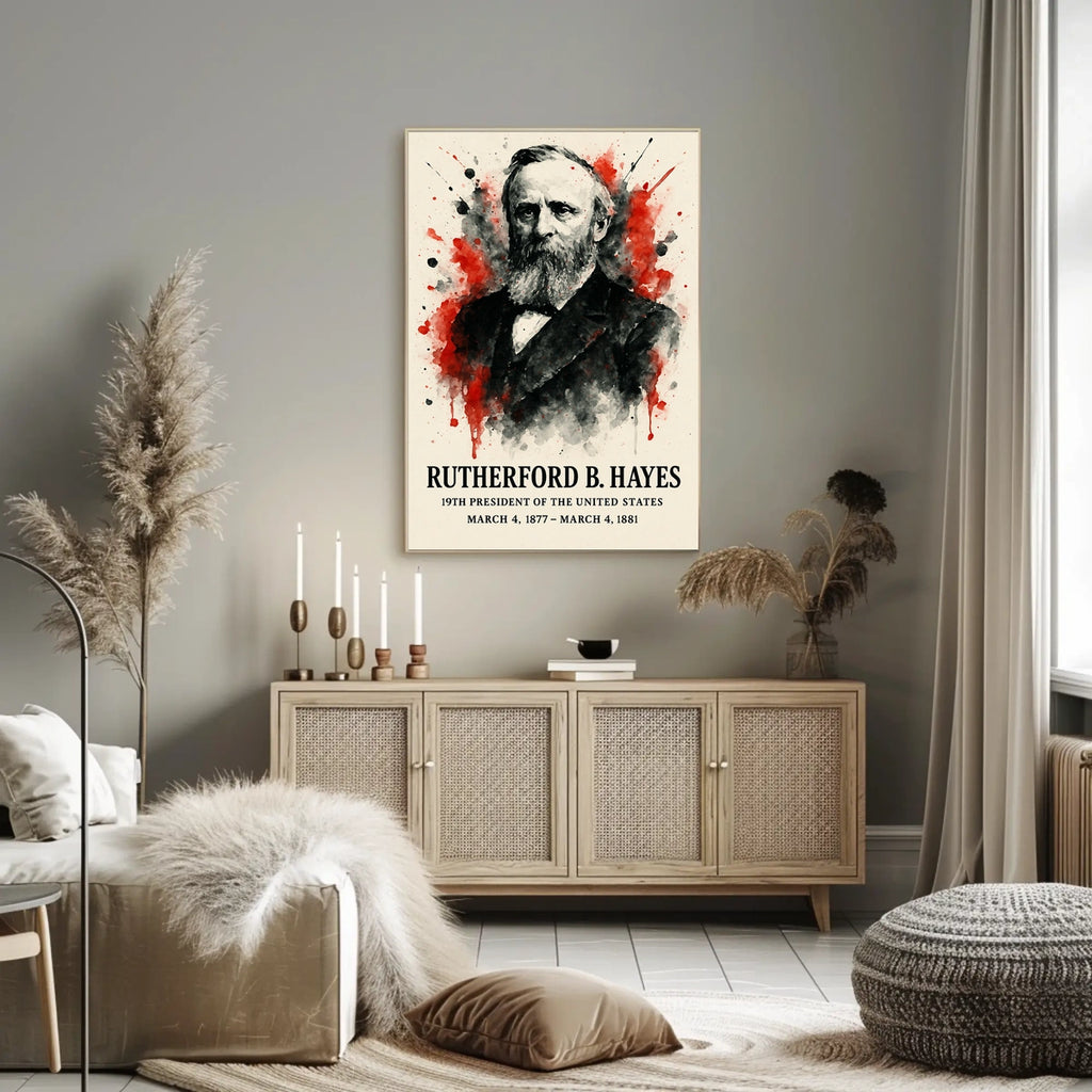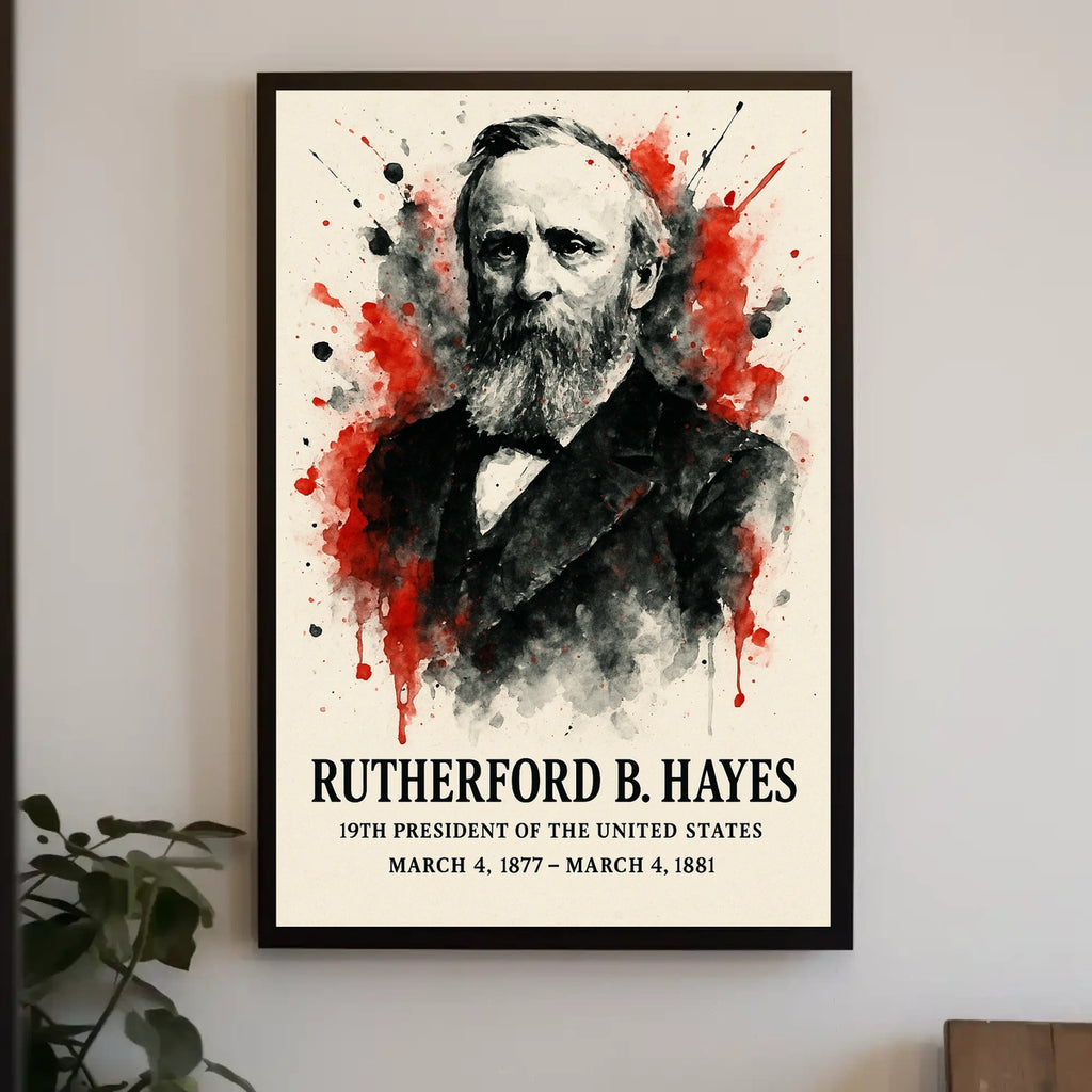 Inspired by post-Civil War America, this poster presents Rutherford B. Hayes in a vibrant watercolor style that blends bold black and red splatters with a dignified central presidential portrait. The painterly technique and vintage mood evoke patriotism and learning, making it a striking visual as well as an educational piece for classrooms, offices, or living spaces.