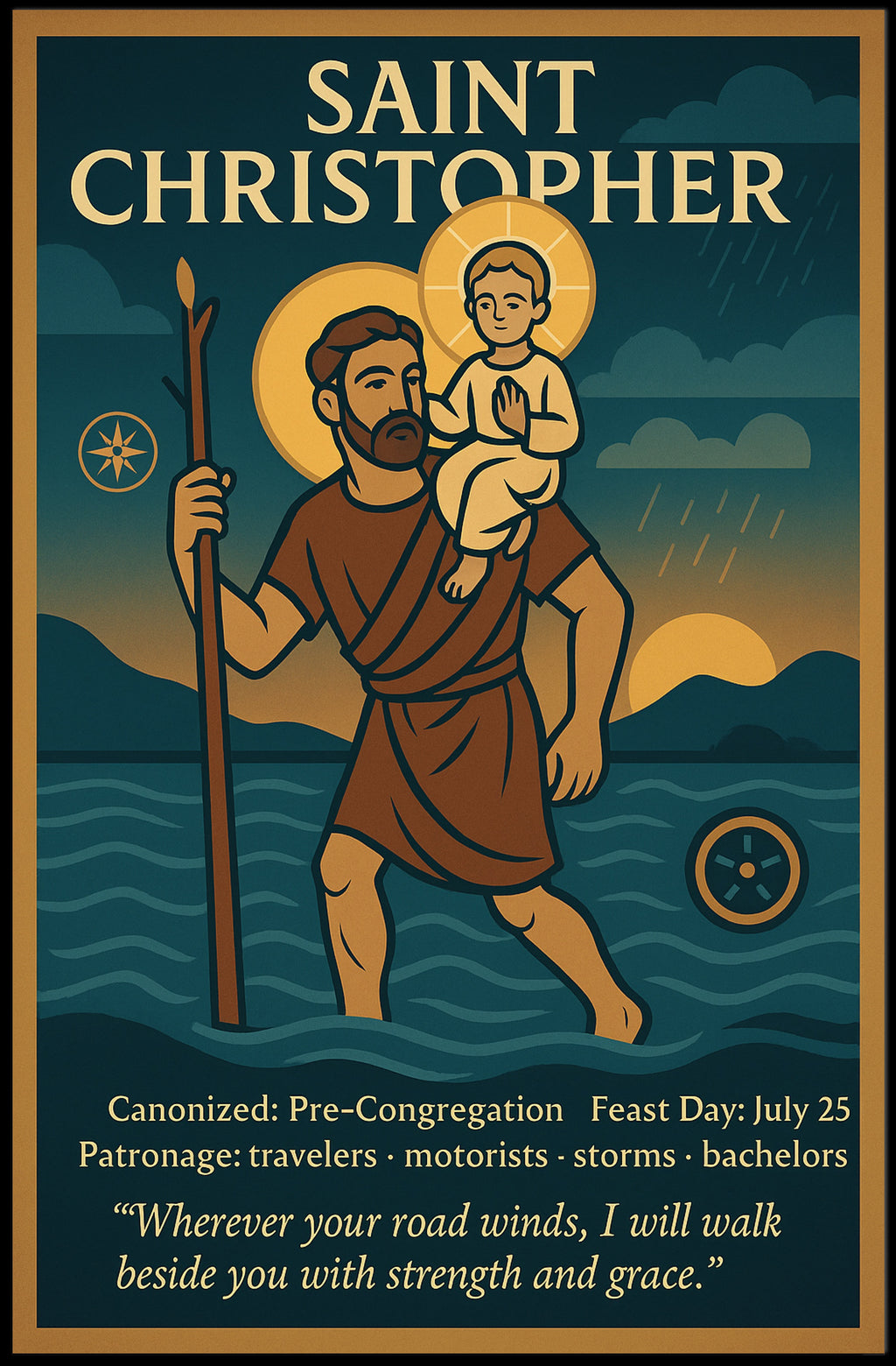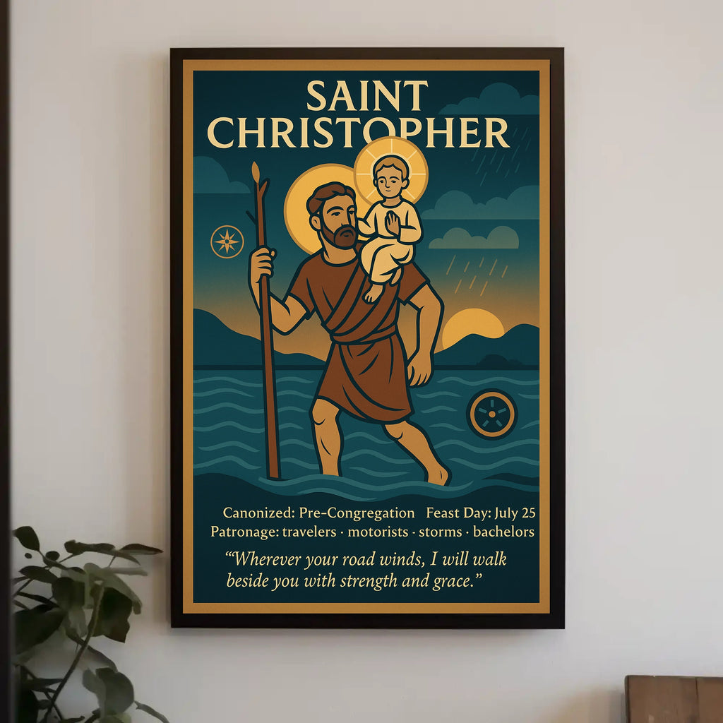 Immerse yourself in the timeless depiction of Saint Christopher in this culturally rich poster, where vintage artistry meets religious symbolism. The artwork captures the essence of protection and guidance as Saint Christopher carries a child, symbolically Christ, across a serene body of water. The inclusion of a staff, gentle water waves, and a sun setting behind clouds contributes to a sense of hope and tranquility. With its blues and earthy tones, this piece exudes warmth and comfort, making it an exemplary addition to any space seeking artistic and spiritual enrichment.