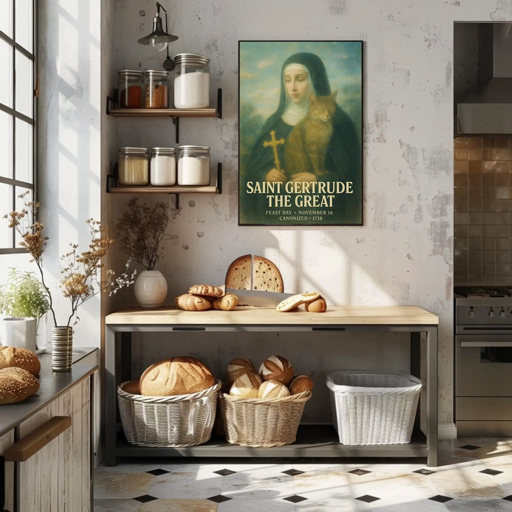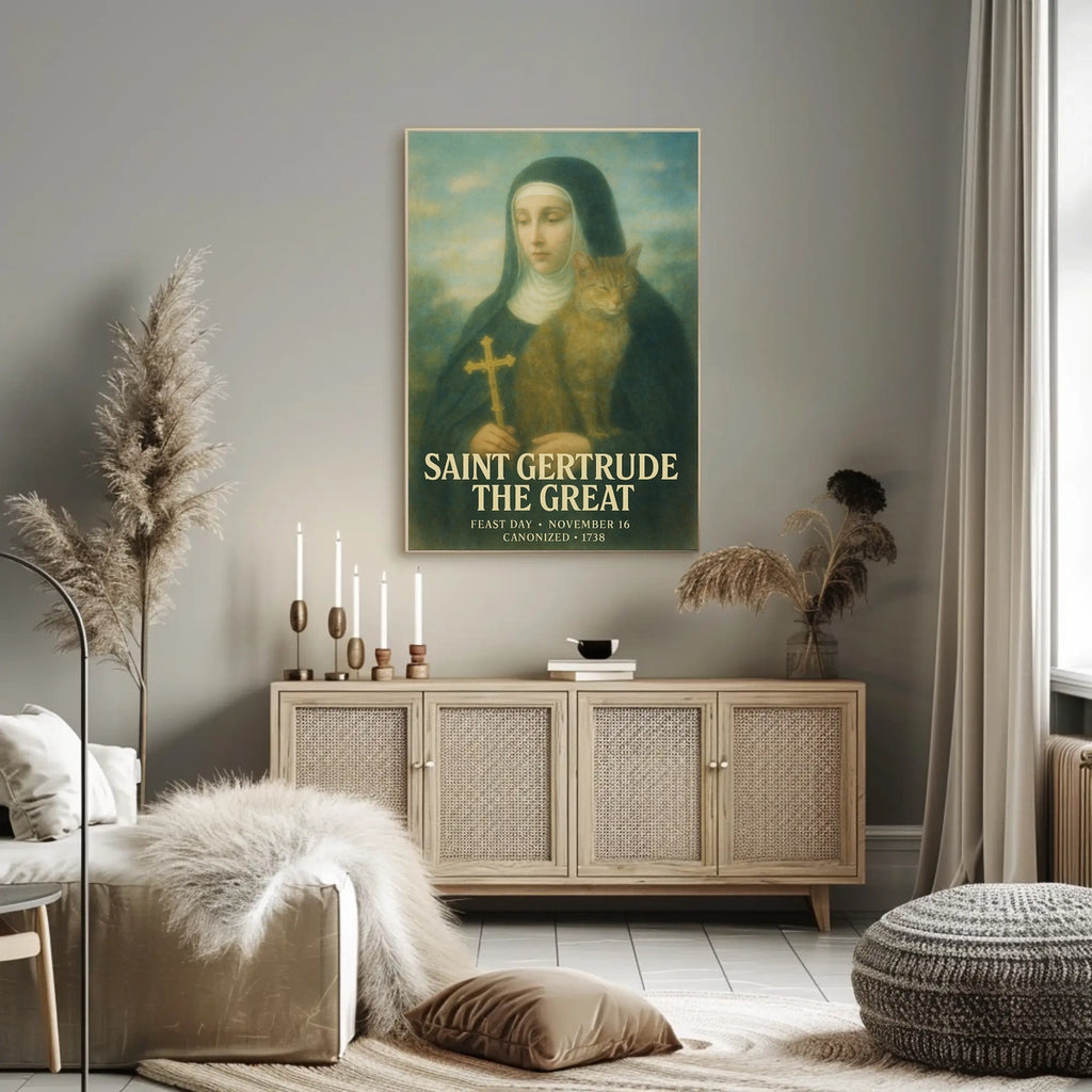 Perfect for homes, classrooms, or offices, this Saint Gertrude The Great poster blends sacred art with travel-inspired scenery to spark conversation and elevate any space.