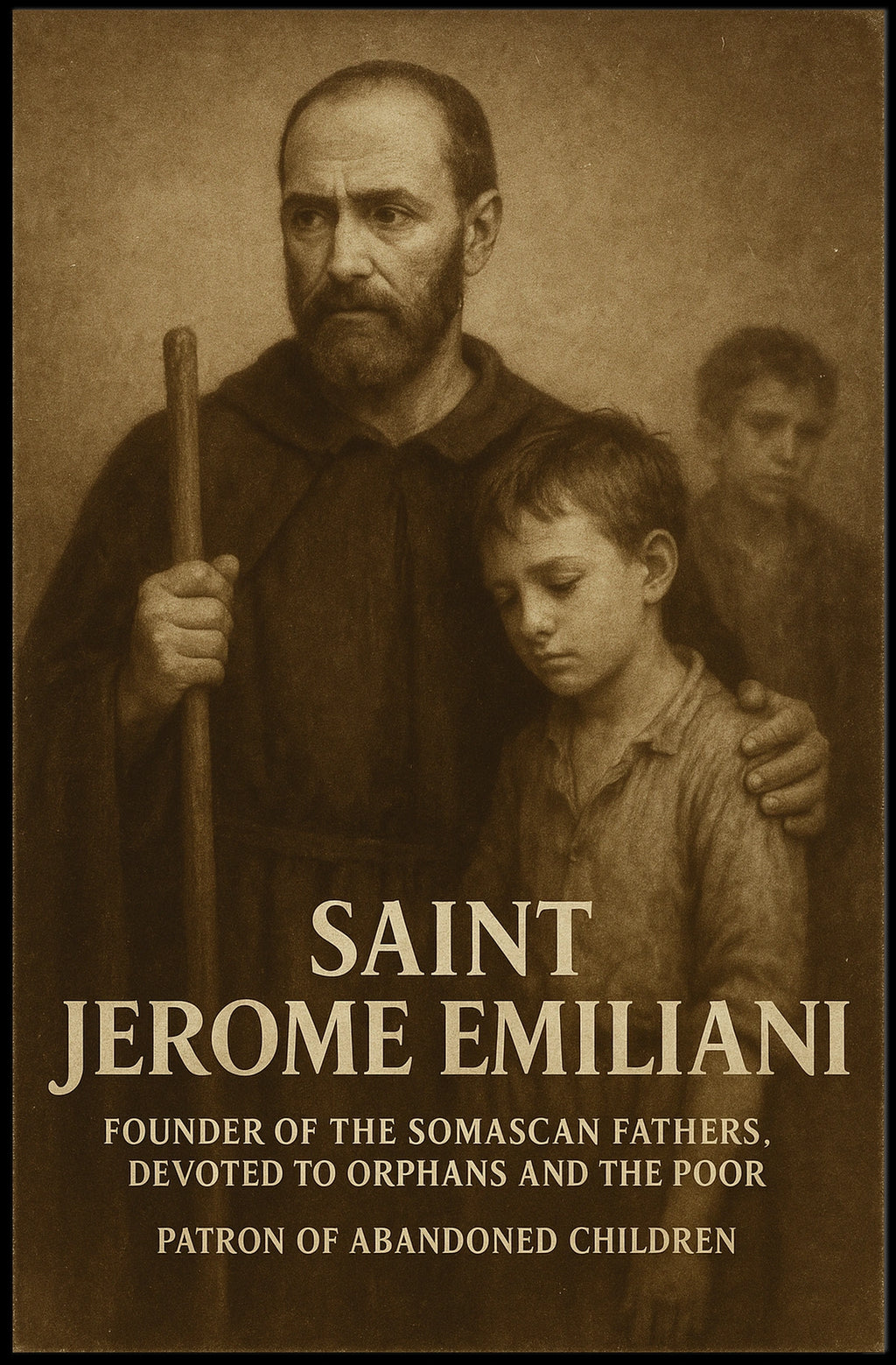 Detailed design highlighting Saint Jerome Emiliani and his compassionate mission to care for abandoned children