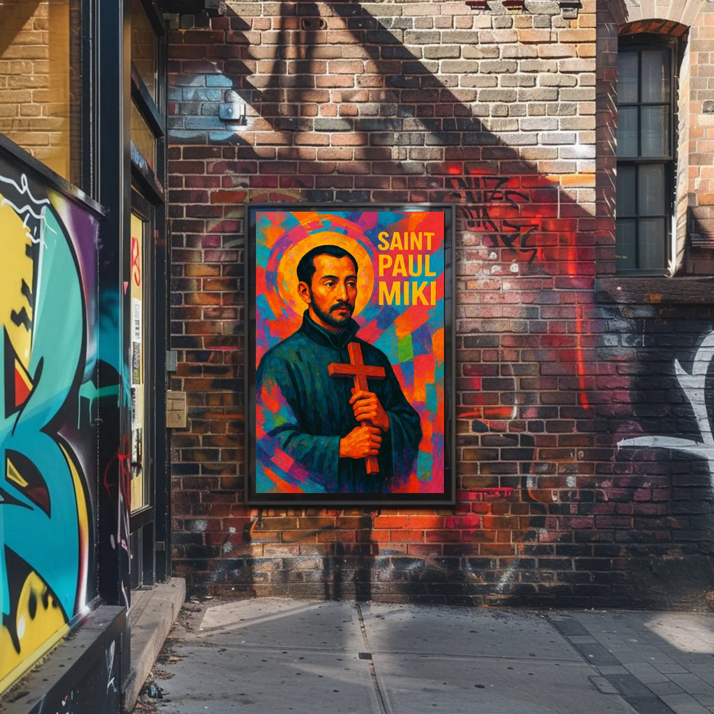 - Detailed design highlighting Saint Paul Miki against evocative real-world scenery