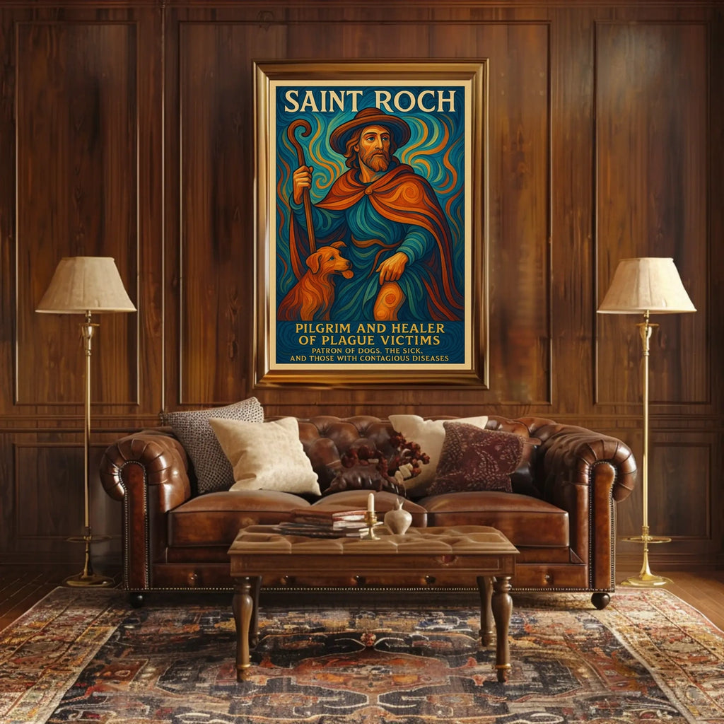 Celebrate the timeless charm of Saint Roch Patron of Dogs and the Sick with this poster designed for decor lovers and wanderlust spirits. This art print captures the essence of Saint Roch, bringing its quiet grace and symbolic meaning into any room.