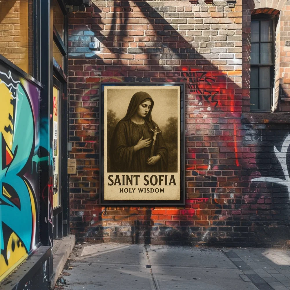 Experience a serene and contemplative journey through "SAINT SOFIA: HOLY WISDOM." This exquisitely detailed poster presents a woman enveloped in spiritual grace, clutching a crucifix close to her heart as she dons a traditional religious robe. The soft sepia tones and blurred pastoral background echo the styles of medieval and Renaissance religious paintings, creating an aura of aged elegance.
