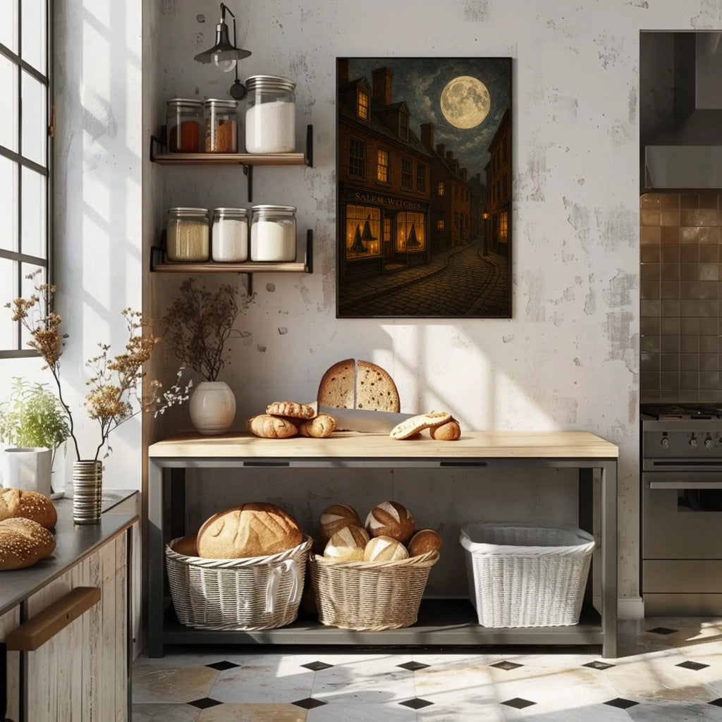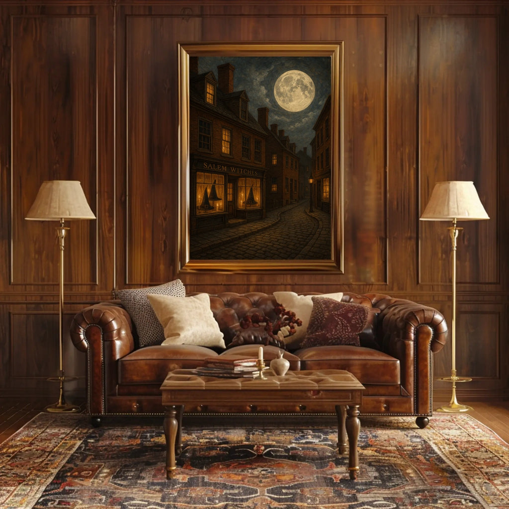 With an atmospheric design that echoes a historical town, a cobblestone street, and the glow of a full moon, this piece blends vintage Gothic style with moody artwork. The storefront signs—such as the iconic "SALEM WITCHES" sign—and witch hats in the windows evoke supernatural allure and centuries of lore.