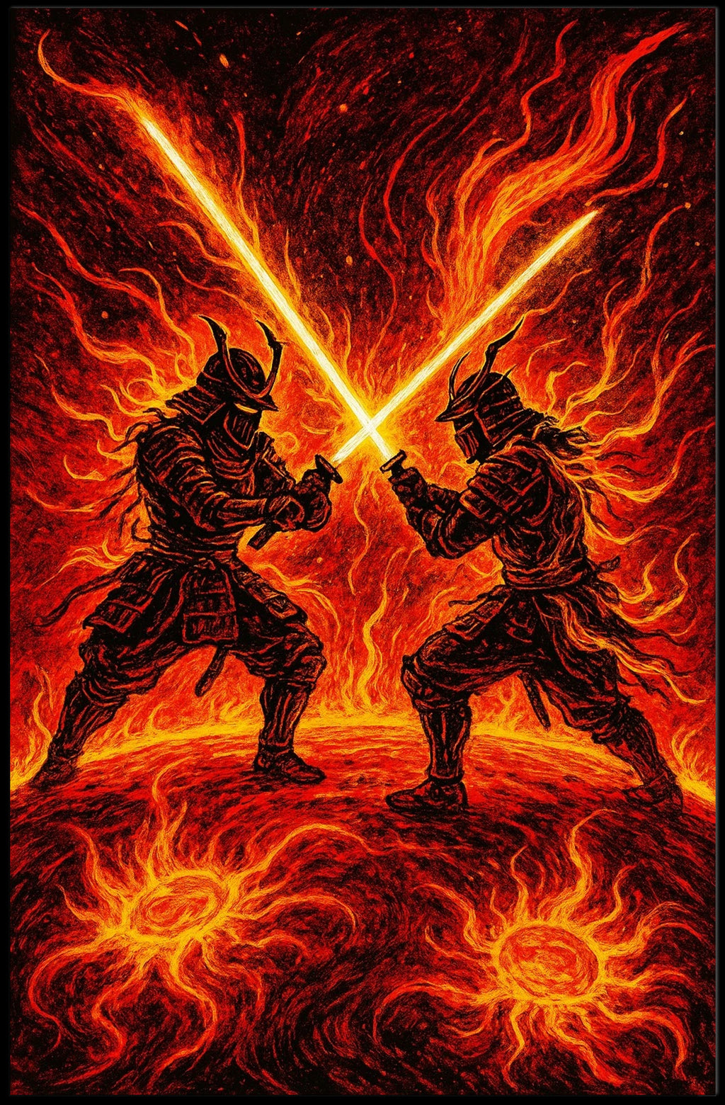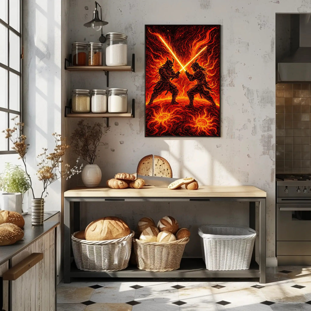 Experience the clash of tradition and imagination in this stunning poster that captures two armored samurai locked in a fierce duel. Their glowing swords, reminiscent of lightsabers, create an electrifying visual contrast against the fiery backdrop. This image expertly blends the ancient art of samurai warfare with futuristic sci-fi elements, resulting in a piece that is as culturally rich as it is visually striking. Perfect for fans of both historical epics and futuristic fantasies, this poster will add an element of dynamic energy and intrigue to any space.
