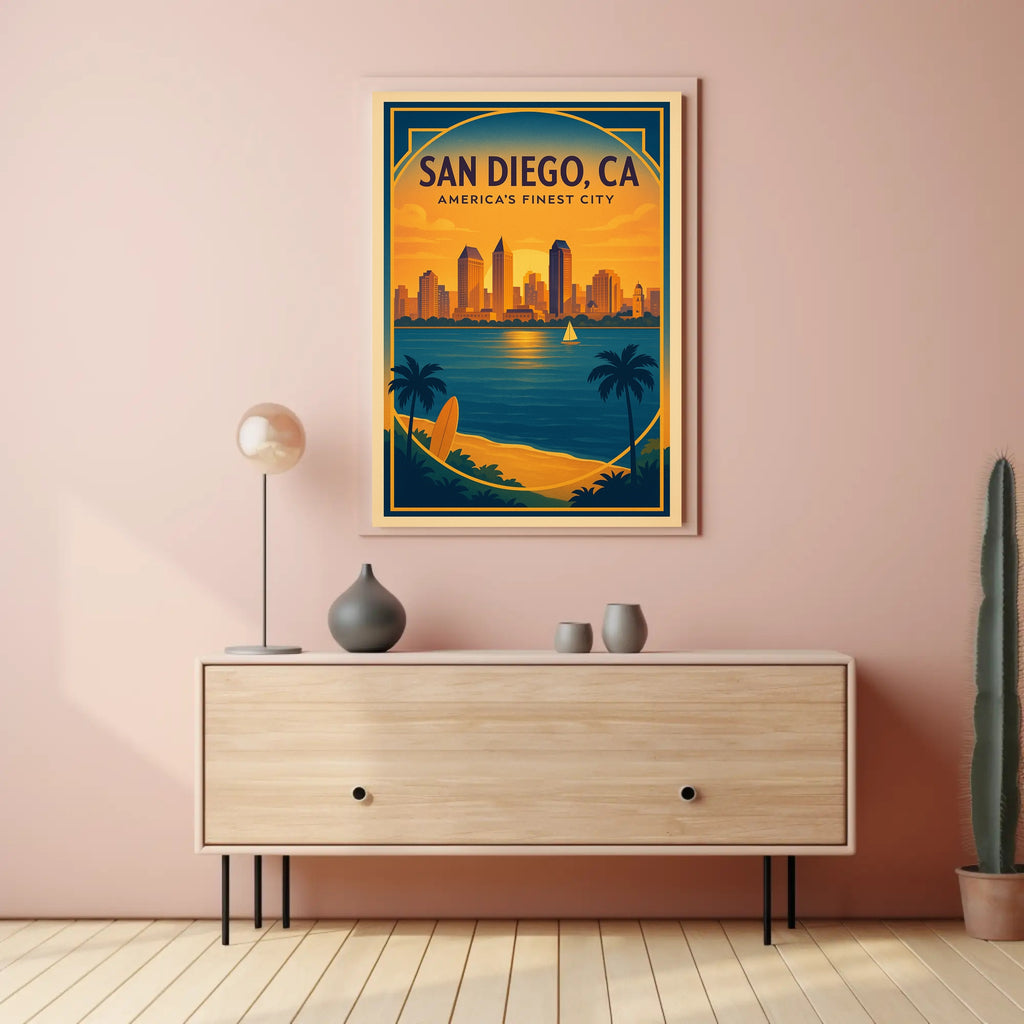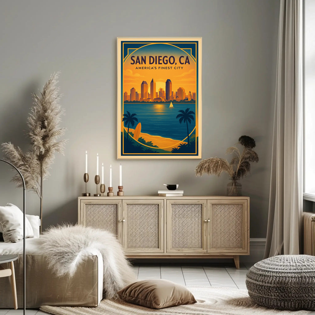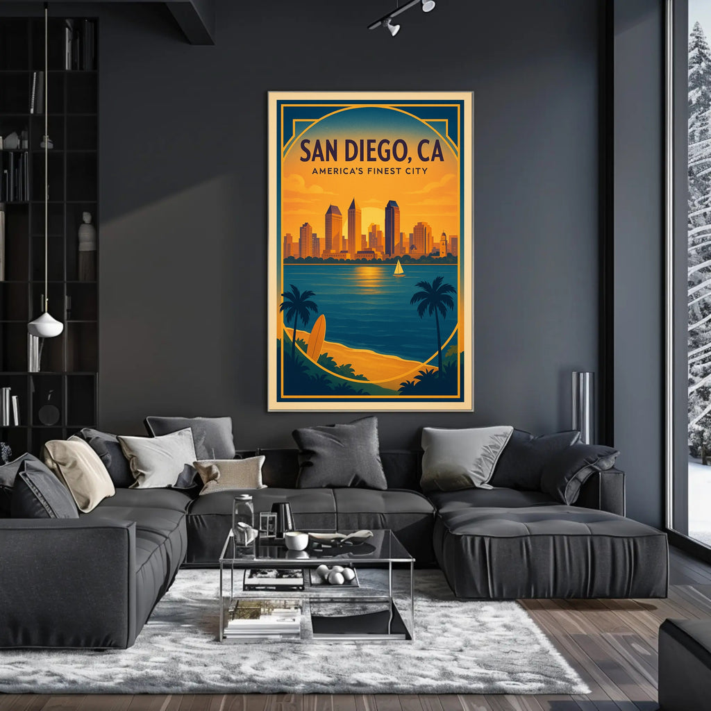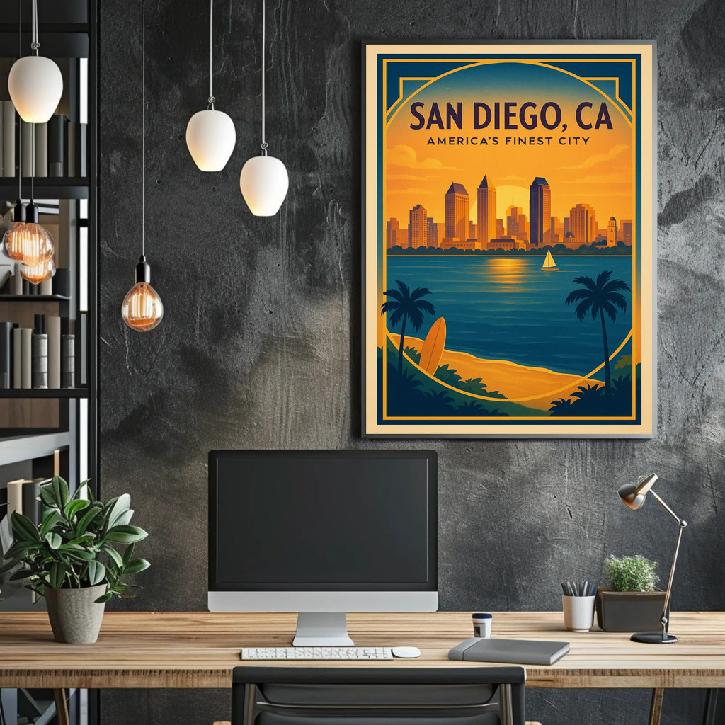 Embrace the coastal vibes and elevate your decor with the San Diego Sunset Vintage Travel Poster. Don't miss out on this beautiful piece; order yours today and bring a slice of California’s finest city into your home!