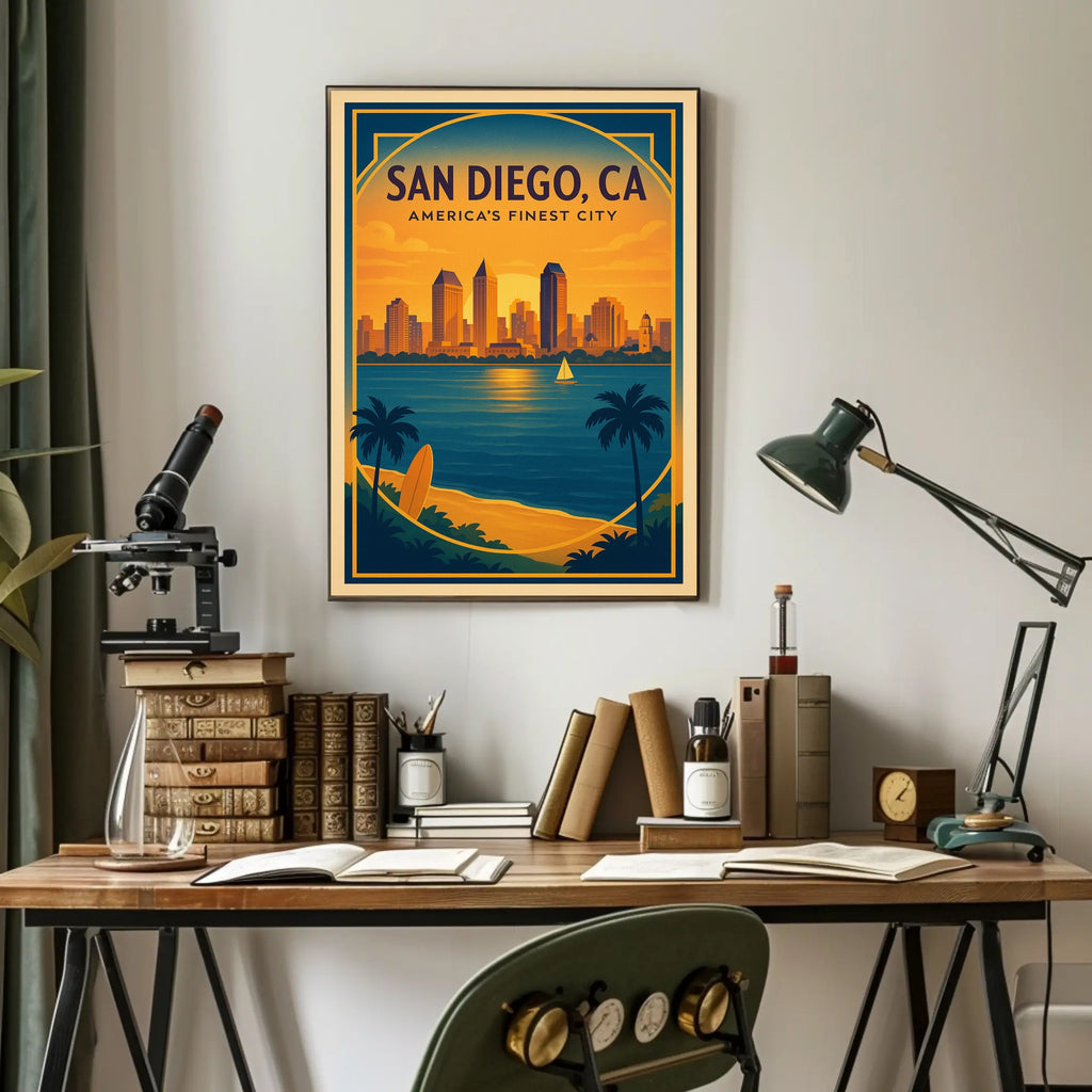 Transform your space with the captivating San Diego Sunset Vintage Travel Poster, a stunning art piece that evokes the charm of California's coastal beauty. Featuring a breathtaking sunset over a skyline of modern skyscrapers, this retro-inspired poster combines vibrant orange and yellow hues with serene beach elements, making it a perfect addition to any art collection or home decor.