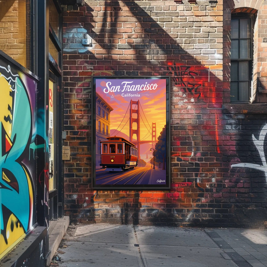 - Striking imagery: A beautifully composed scene featuring the Golden Gate Bridge, a vintage cable car, classic San Francisco architecture, and a glowing sunset palette that draws the eye.