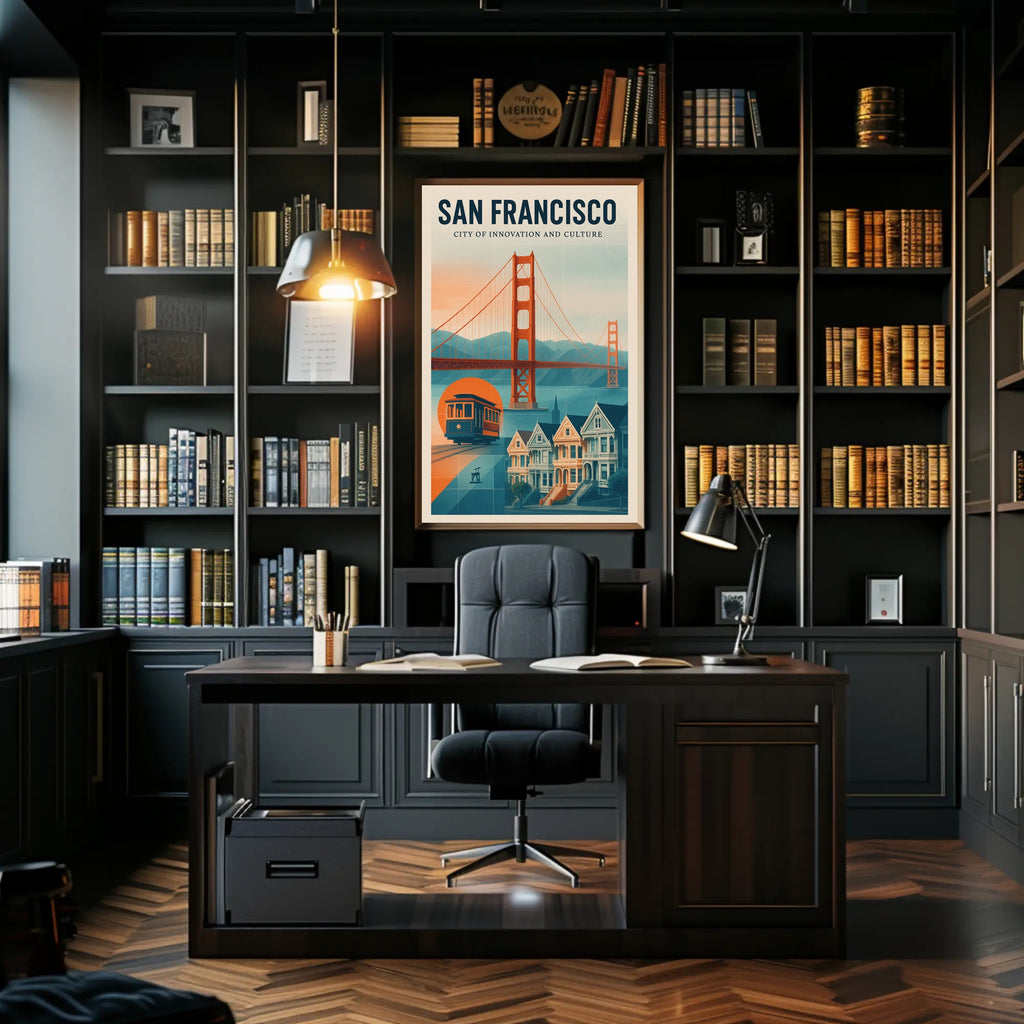 Bring the spirit of the West Coast into your home with the "San Francisco — City of Innovation and Culture" poster by PosterGoat. This striking art print blends retro travel-poster styling with a modern minimalist palette, featuring the iconic Golden Gate Bridge, a classic cable car, and the famed Painted Ladies — all composed in clean lines and warm orange-and-teal tones to elevate any room.
