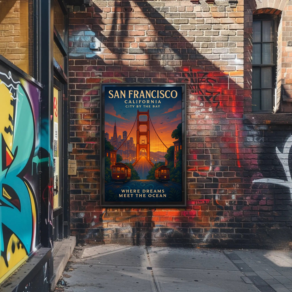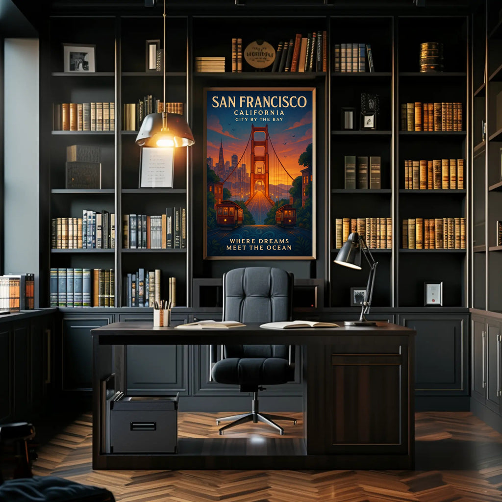 San Francisco Dreams Vintage Travel Poster by PosterGoat brings the romance of the City by the Bay into your home with a warm, nostalgic vintage-style illustration. Rich sunset tones highlight the iconic Golden Gate Bridge framed by classic cable cars and a softly glowing skyline — an instant focal point for living rooms, offices, or entryways.
