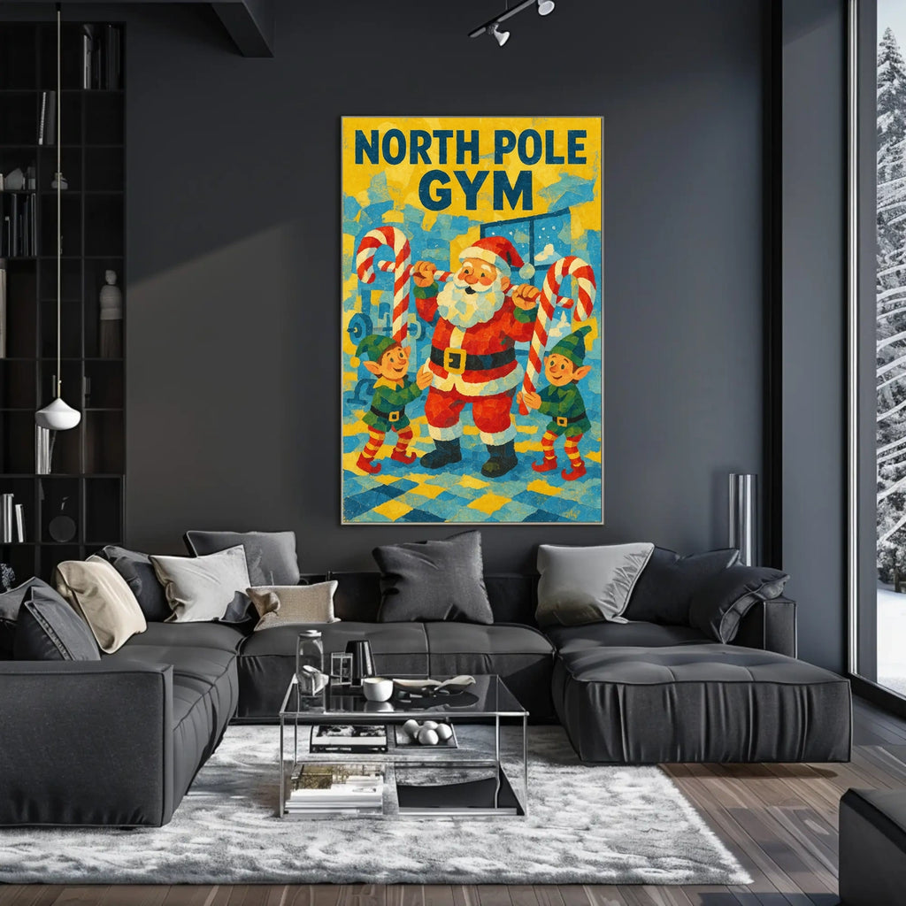 - Printed with precision and made to inspire, this artwork is more than decoration—it’s a conversation piece that connects holiday magic, nostalgia, and festive style. Bring Santa Claus at North Pole Gym into your home, classroom, or office today and let your walls tell a powerful story.