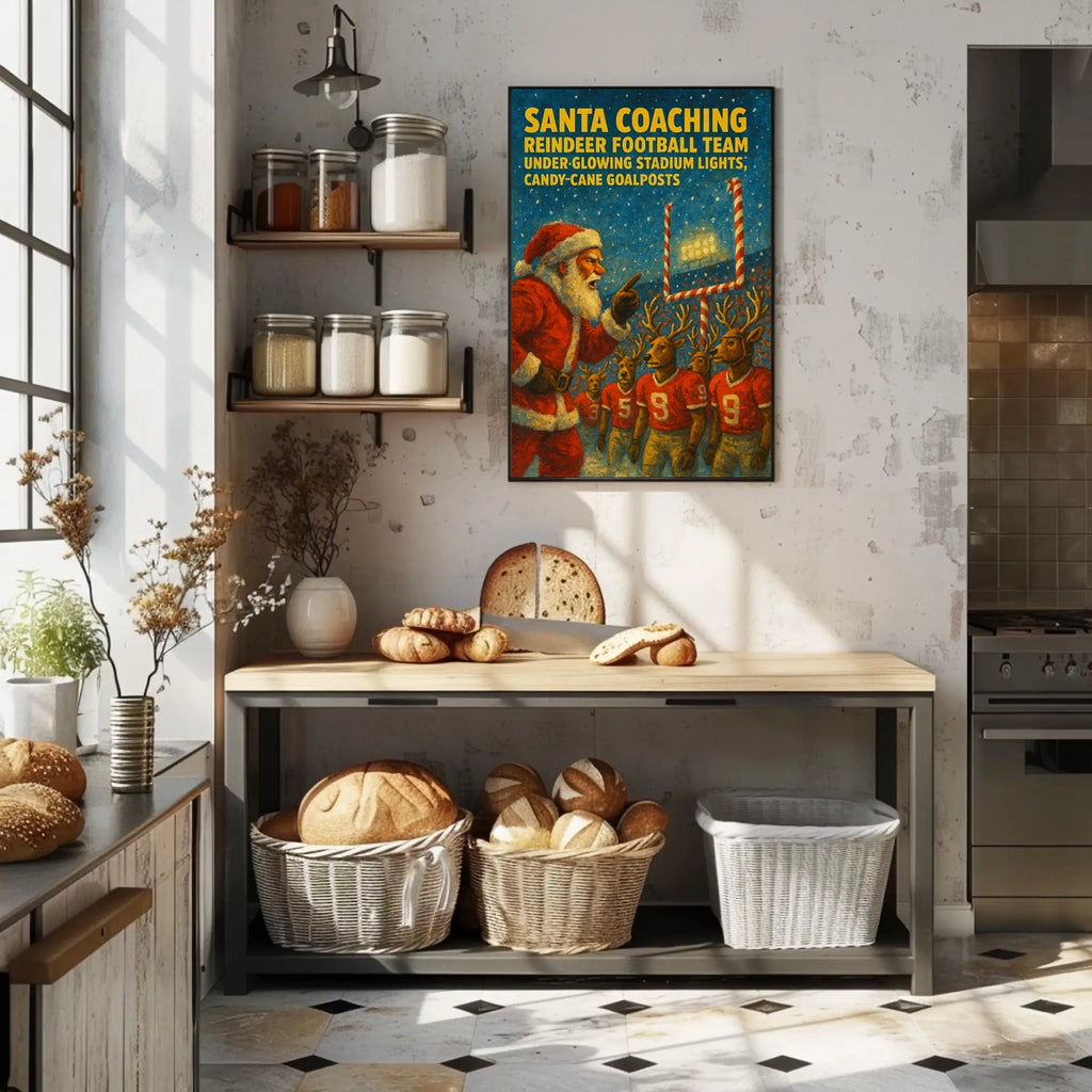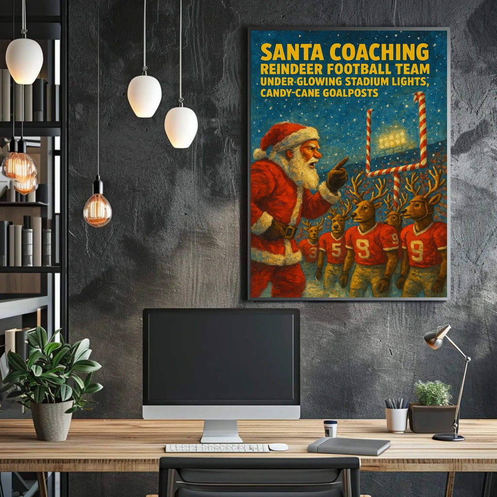 Celebrate the season with the Santa Claus Coaches Reindeer Football Team Poster, a whimsical winter wonderland scene that fuses holiday charm with sports spirit. Set in a snow-laden stadium under the glow of bright floodlights, this painting-like poster features Santa as a charismatic coach guiding a squad of reindeer in vibrant red jerseys toward candy-cane goalposts, blending festive humor with timeless appeal.