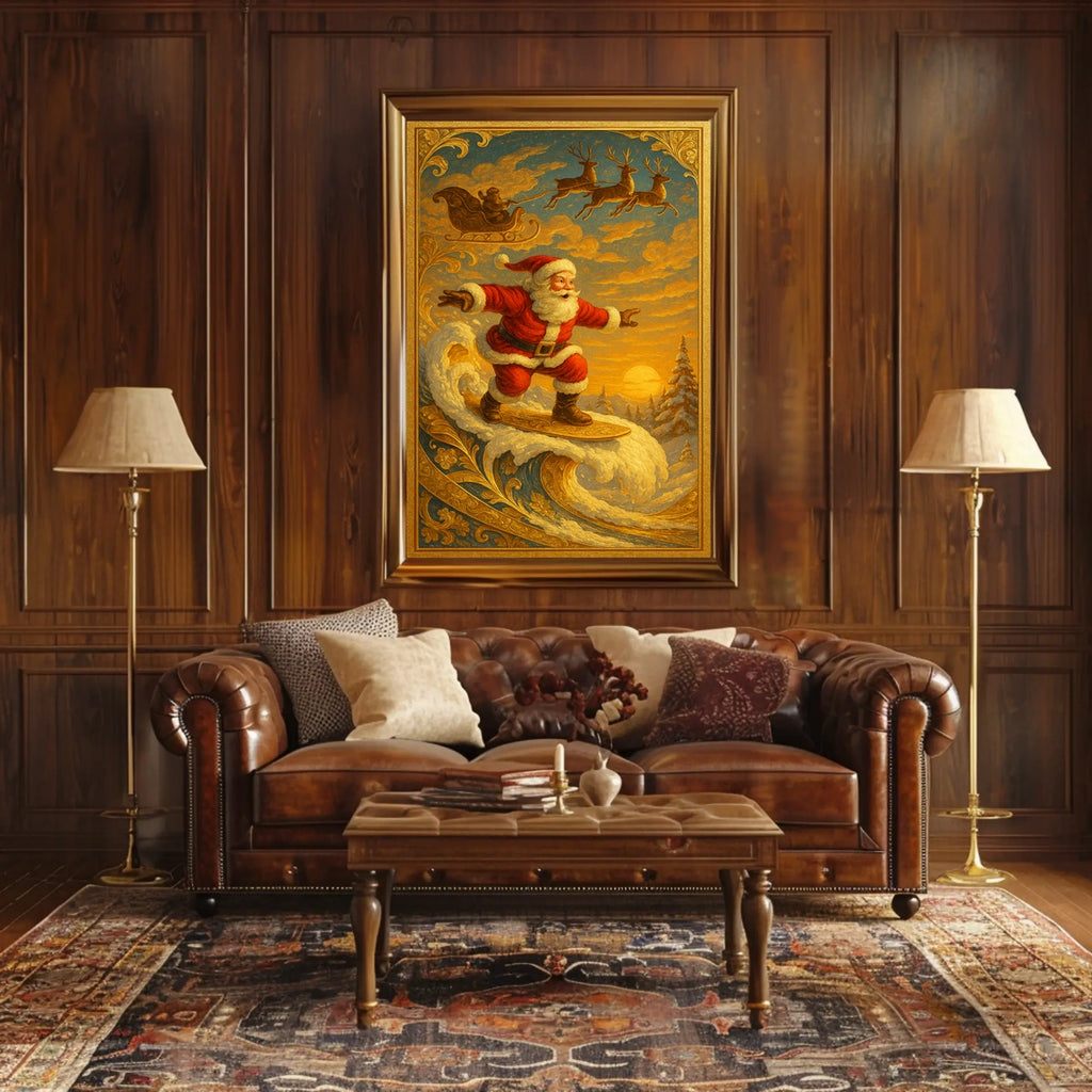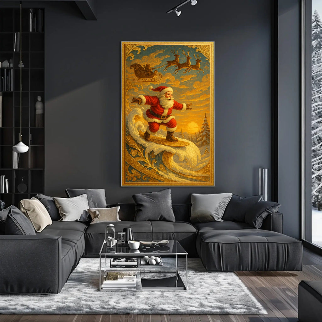 Experience the magic of the holiday season with the Santa Claus Surfing Vintage Christmas Poster. This enchanting wall art captures Santa Claus riding a snow wave on a snow-crafted surfboard, bringing a playful twist to traditional Christmas imagery. In the background, his sleigh and reindeer soar across a breathtaking sunset sky, adding a dash of adventure to the scene. Rendered in a vintage artistic style with warm golden tones, this poster exudes festive cheer and nostalgia.