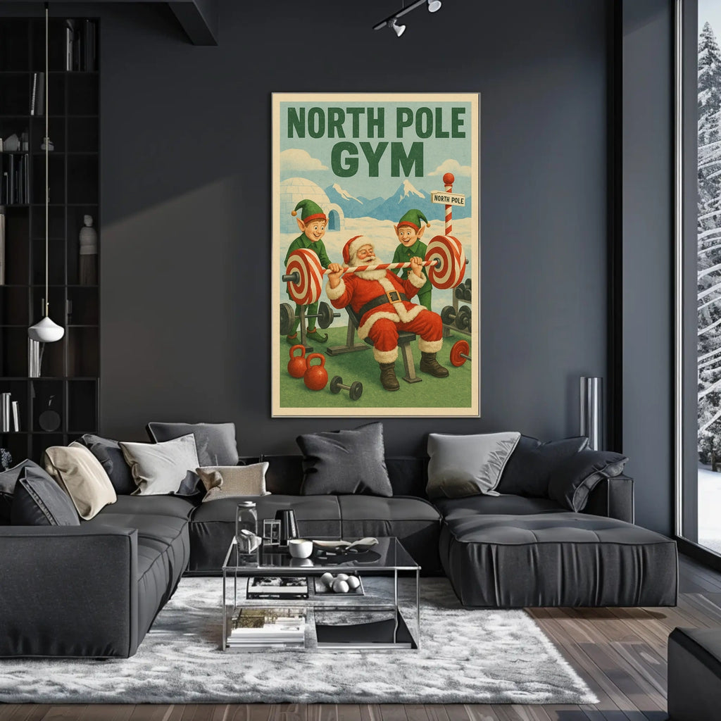 Detailed design highlighting Santa's playful weightlifting and the North Pole gym scene