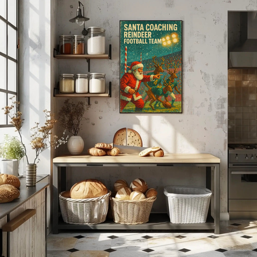 Conversation-worthy piece that connects holiday magic, sports, and whimsy — bring Santa Coaches Reindeer Football Team Vintage Poster into your home, classroom, or office today.