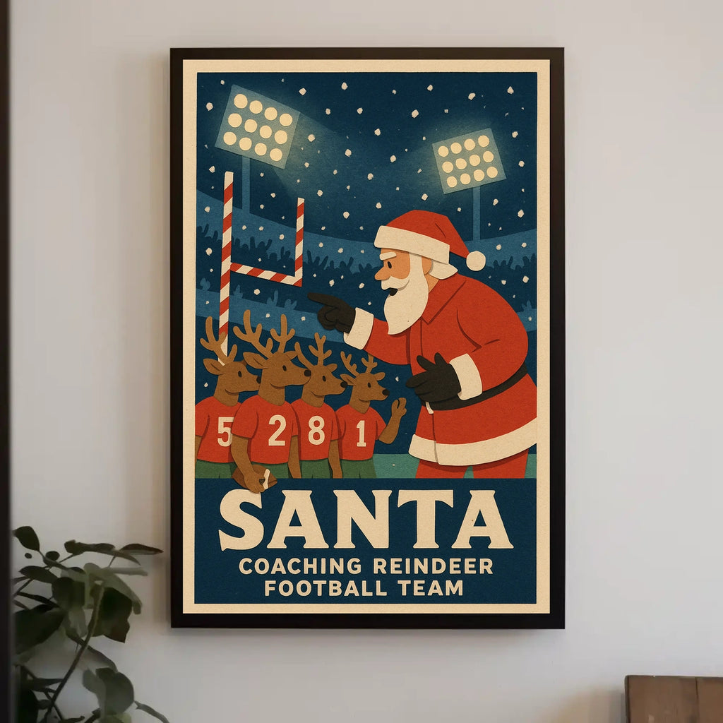 Santa Coaches Reindeer in Vintage Football Scene — Step into a whimsical winter wonderland with this charming poster, where Santa Claus takes on the role of a football coach for his reindeer team. Set in a snowy stadium under the glow of floodlights, this scene captures the magic of Christmas with a playful twist. The reindeer, donned in red jerseys, eagerly listen to Santa's spirited guidance. The candy-cane striped goalposts add a festive touch, while the vintage artistic style and retro color palette evoke nostalgia. Perfect for holiday enthusiasts and sports fans alike, this poster brings cheer and humor to any space.
