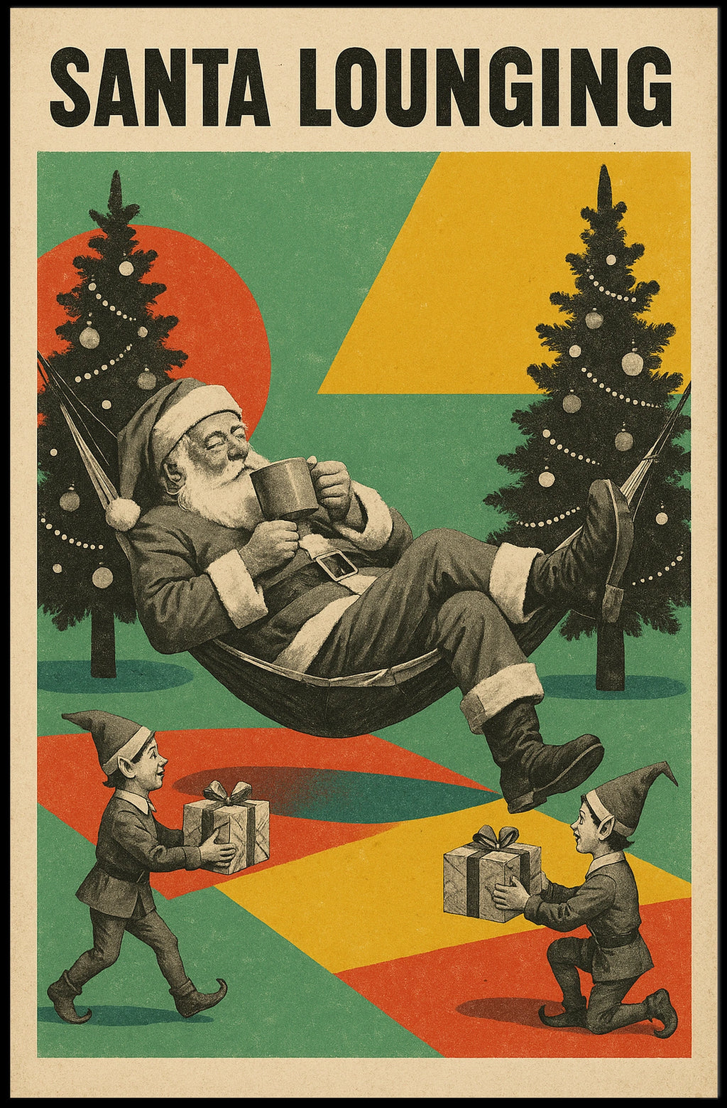 Santa Lounging: Vintage Christmas Poster Art Celebrate the festive season with this charming poster, capturing a whimsical holiday scene. Santa Claus takes center stage, reclining in a hammock with a drink in hand, embodying the spirit of relaxation. Flanked by two cheerful elves bearing gifts, the scene is framed by beautifully decorated Christmas trees. The vintage illustration style, reminiscent of mid-20th-century postcards, adds a nostalgic touch with its textured look. Bold geometric shapes in primary colors create a vibrant, retro aesthetic, making this poster a perfect addition to any Christmas decor or holiday-themed collection.