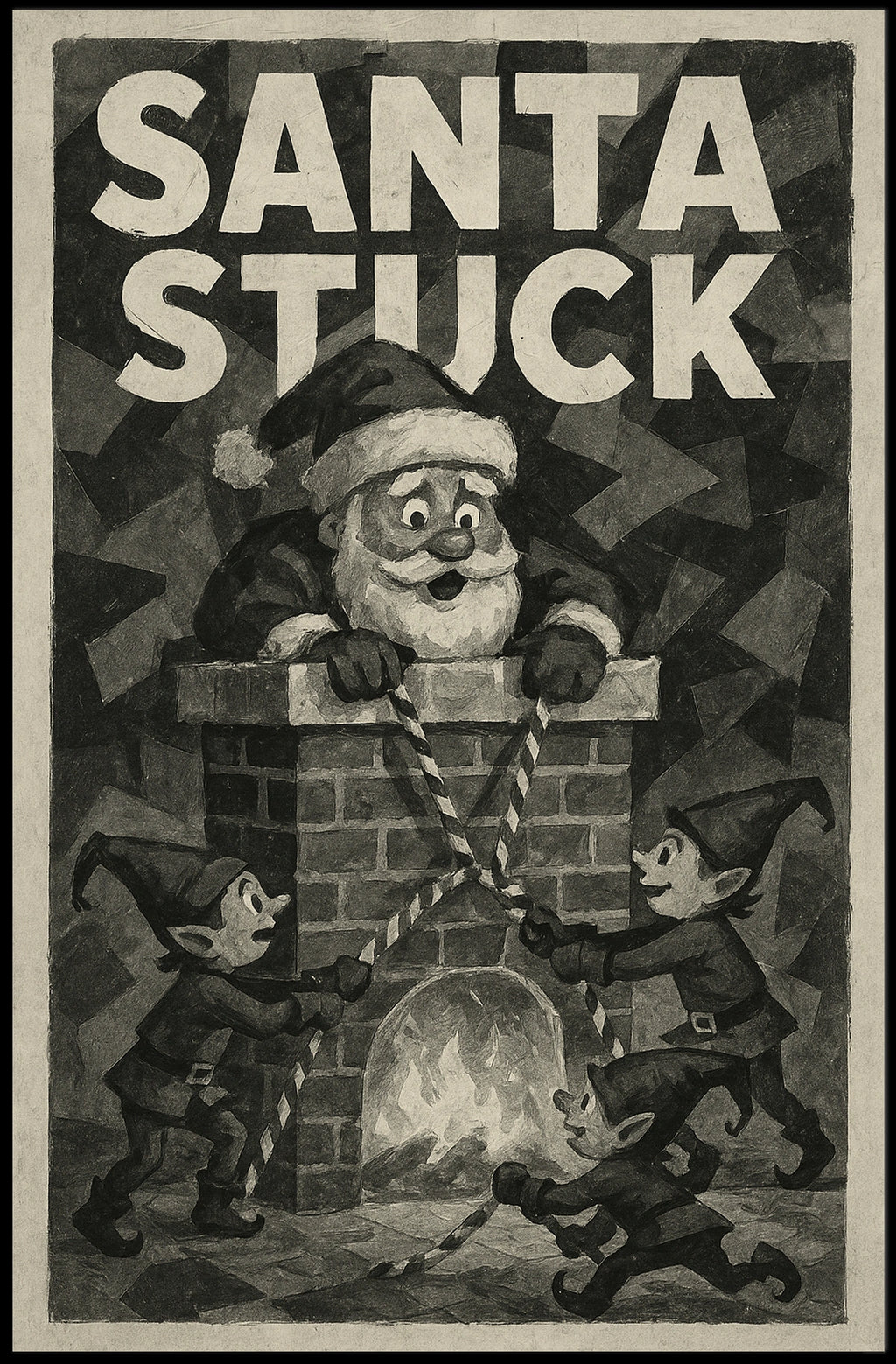 Celebrate the holiday season with the Santa Stuck in Chimney Christmas Pop Culture Poster. This amusing Christmas poster depicts Santa Claus hilariously stuck in a chimney while three industrious elves attempt a comedic rescue. Reminiscent of mid-20th-century holiday cards, the vintage-style illustration features muted colors and simple shapes, capturing the nostalgic and festive spirit of Christmas. The playful scene highlights Santa in his classic attire and cheerful elves, delivering a lighthearted take on teamwork during holiday festivities.