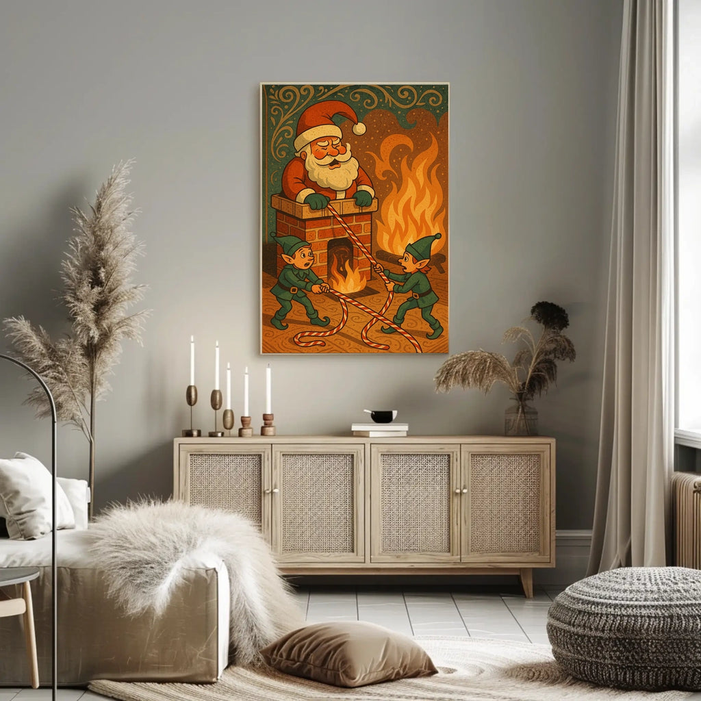 Celebrate the beauty of Santa's Chimney Caper: Festive and Vintage Christmas Poster, a timeless wall art piece designed to capture its unique appeal. This whimsical Christmas poster humorously captures Santa Claus stuck in a chimney, with two helpful elves using a candy cane-striped rope in a hilarious rescue scene. Set indoors by a cozy, roaring fireplace, the illustration embodies the festive spirit of Christmas. The vintage cartoon style, with bold outlines and warm, muted colors like reds, greens, and browns, brings nostalgia and cheer. Swirling decorative patterns evoke classic holiday illustrations, making it an ideal choice for seasonal decor or festive advertisements. Relive the joy of the holidays with this lighthearted, nostalgic design.