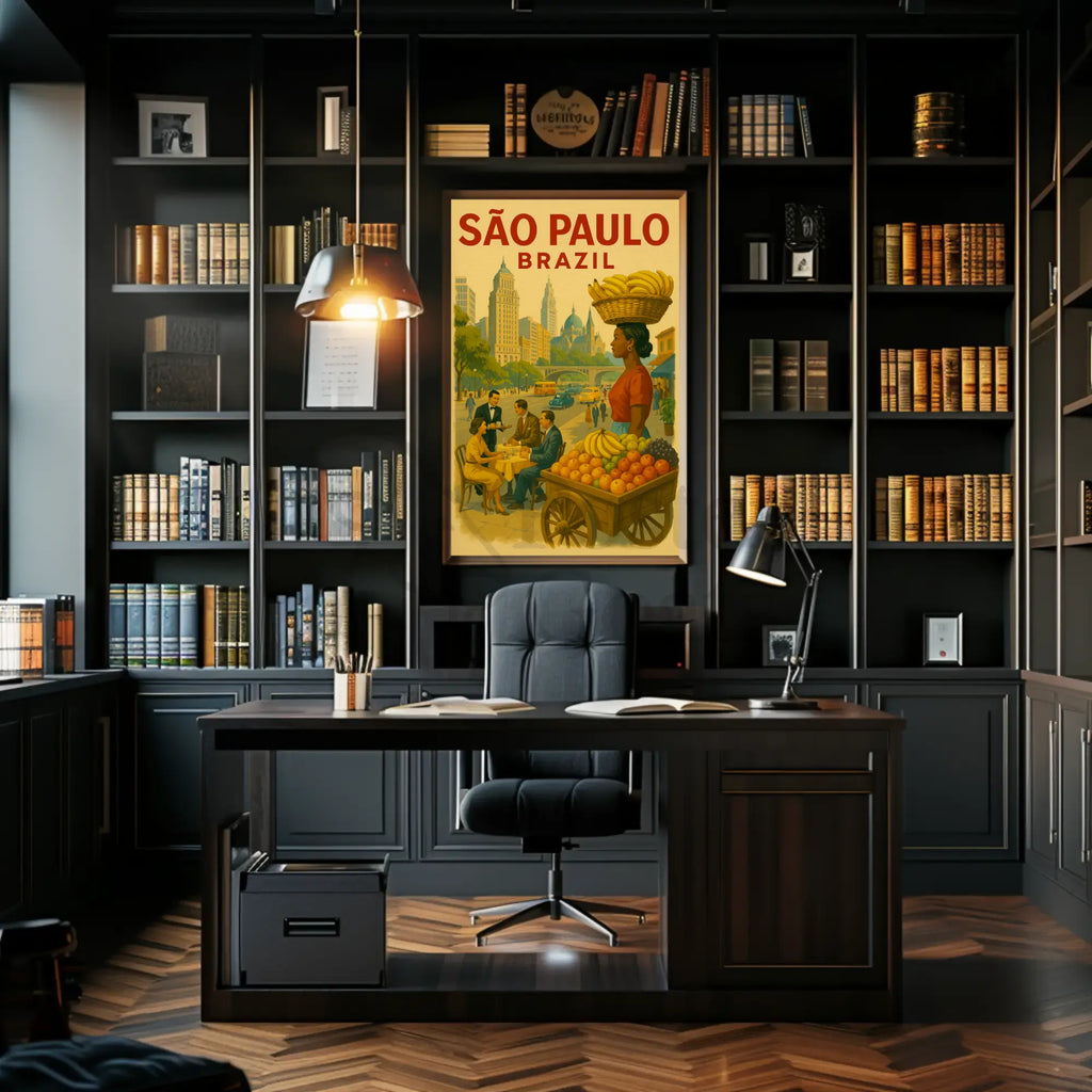 São Paulo City Life Vintage Travel Poster by PosterGoat captures the bustling energy of Brazil’s largest city with a warm, mid-century aesthetic. This vintage-inspired cityscape blends iconic architecture, a cathedral silhouette, and everyday street life into a single evocative scene—complete with a fruit vendor balancing a basket of bananas, sidewalk café patrons, classic cars and a timeless urban skyline.