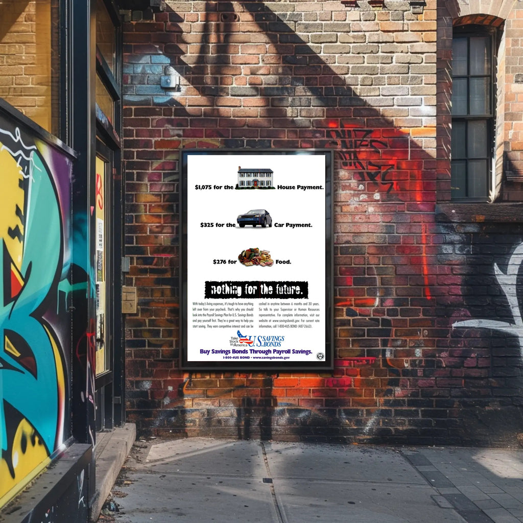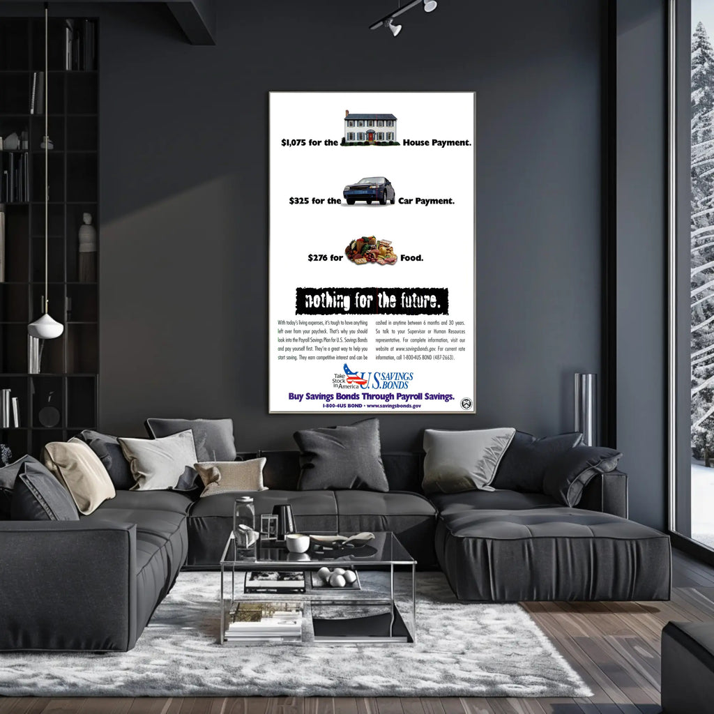 Save for the Future with U.S. Savings Bonds Poster — a striking, minimalist art print from PosterGoat that blends retro financial messaging with clean, decorative appeal. This 18x24 poster features bold typographic calls and simple photographic vignettes of a house, a car and groceries that make the message unmistakable: prioritize saving for tomorrow.