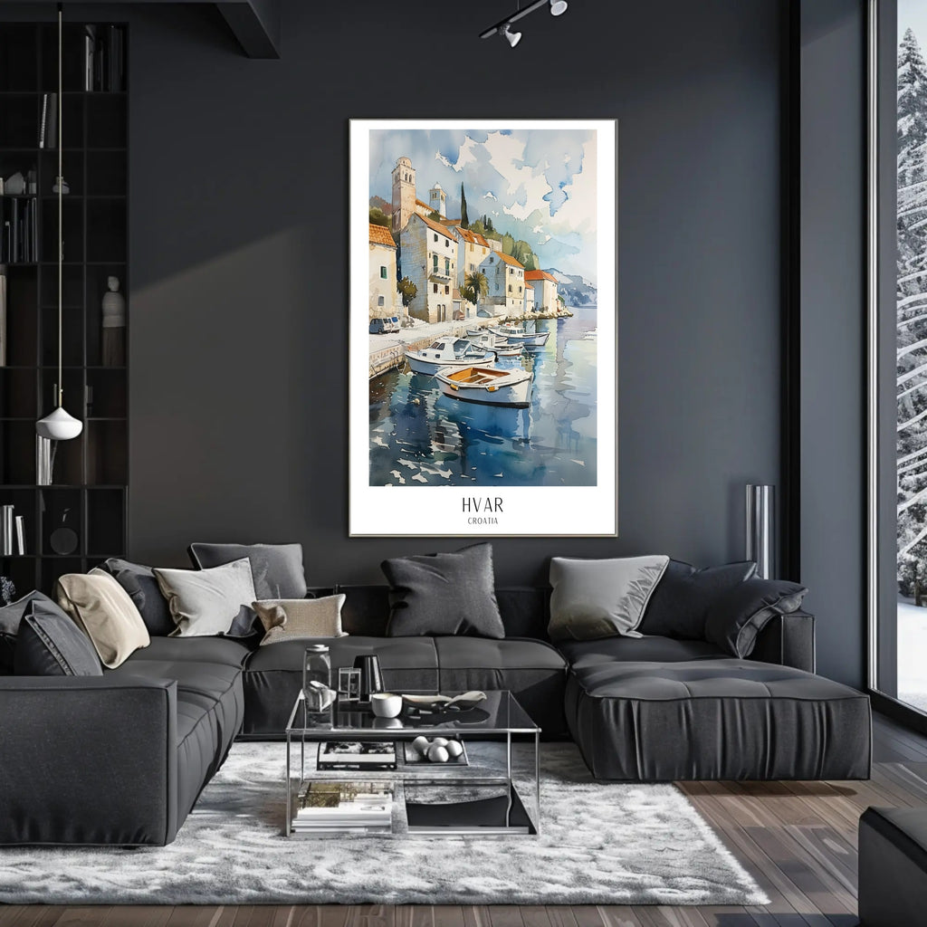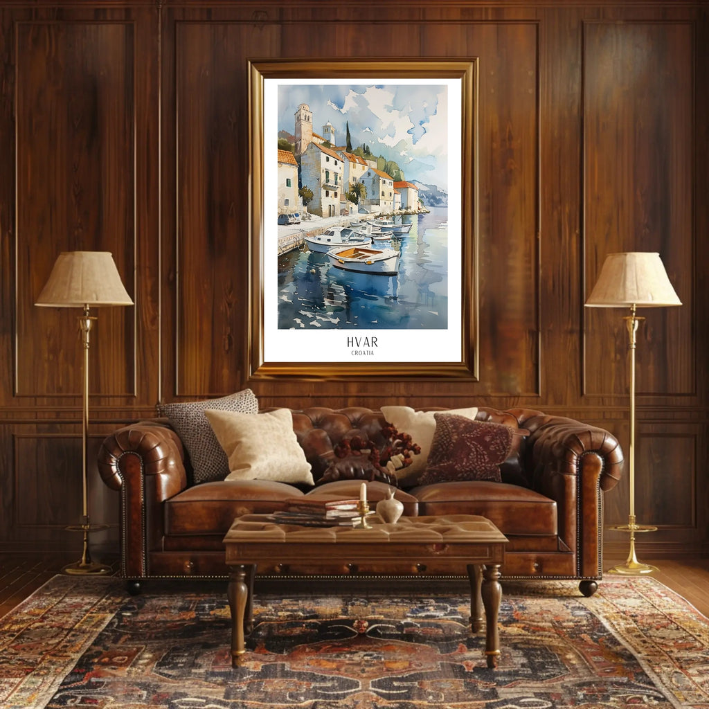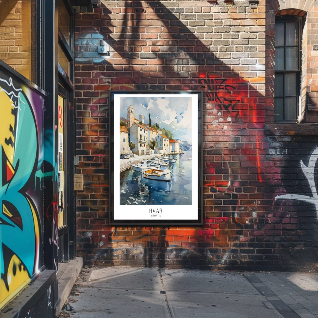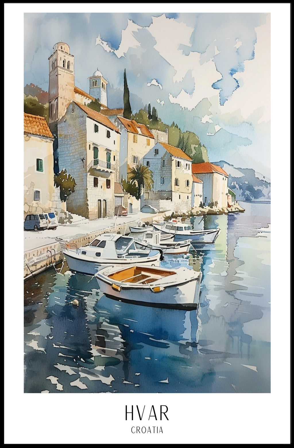 Bring the irresistible coastal charm of Hvar, Croatia, into your home. This Scenic Harbor View of Hvar Croatia Travel Poster from PosterGoat captures a tranquil Mediterranean morning in delicate watercolor—moored boats bobbing on glassy blue water, sun-warmed terracotta roofs, and centuries-old stone architecture reflected in gentle ripples.