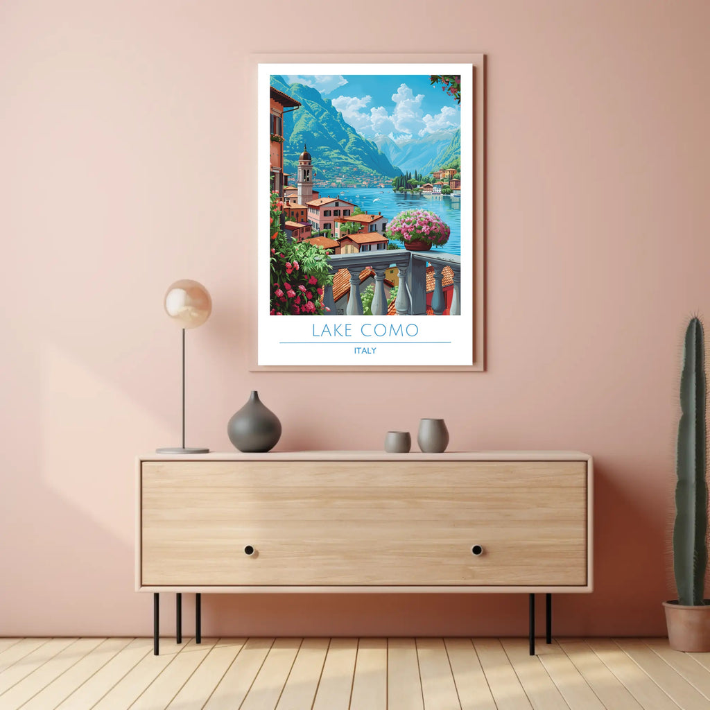 Bring the timeless charm of northern Italy into your home with the Scenic Lake Como Poster from PosterGoat. This vintage-inspired travel print captures a sunlit terrace overlooking turquoise waters, terracotta rooftops, a bell tower, and dramatic alpine peaks — a framed moment of wanderlust perfect for living rooms, bedrooms, or offices.