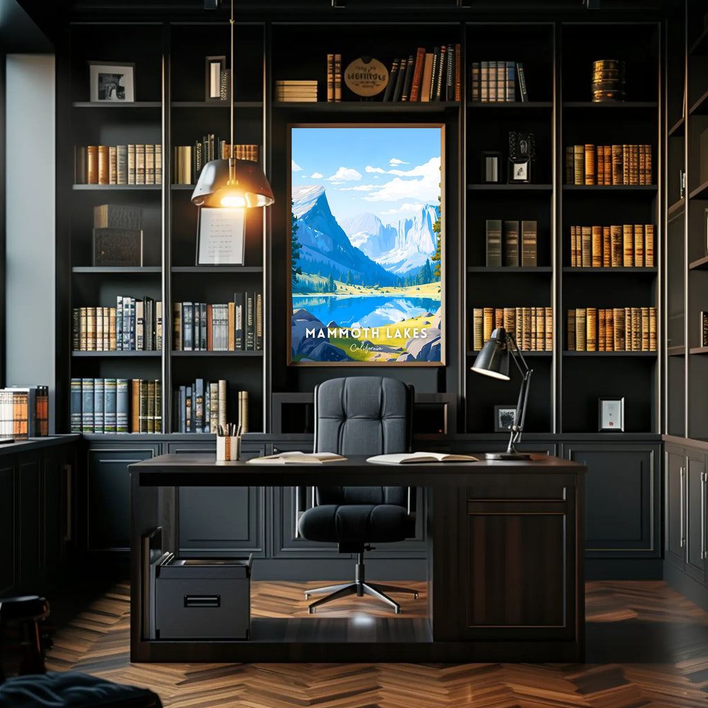 This Scenic Mammoth Lakes Travel Poster makes a memorable gift for nature lovers, a tasteful addition to home & garden decor, and a collector's piece for anyone who appreciates mountain posters and landscape prints. Enhance your space with a peaceful, scenic landscape that captures the natural beauty of northern California.