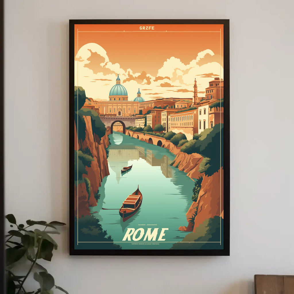 Why you'll love it: The poster blends vintage travel charm with a modern minimalist palette, offering a nostalgic yet fresh depiction of Rome that complements contemporary interiors. Soft sunset tones and crisp linework create depth and atmosphere, while the smooth reflection and two small boats add a peaceful focal point that draws the eye.