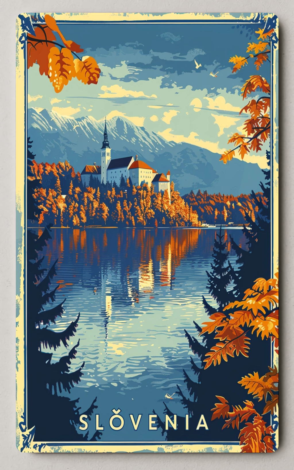 Capture the romance of Central Europe with the Scenic Slovenia Vintage Travel Art Trading Card from PosterGoat — a collectible trading card that transforms a beloved travel poster into a pocket-sized piece of art. This high-quality print reproduces a vintage-inspired scene: a serene alpine lake reflecting a historic castle, framed by autumnal foliage and majestic mountain peaks under a painterly sky.