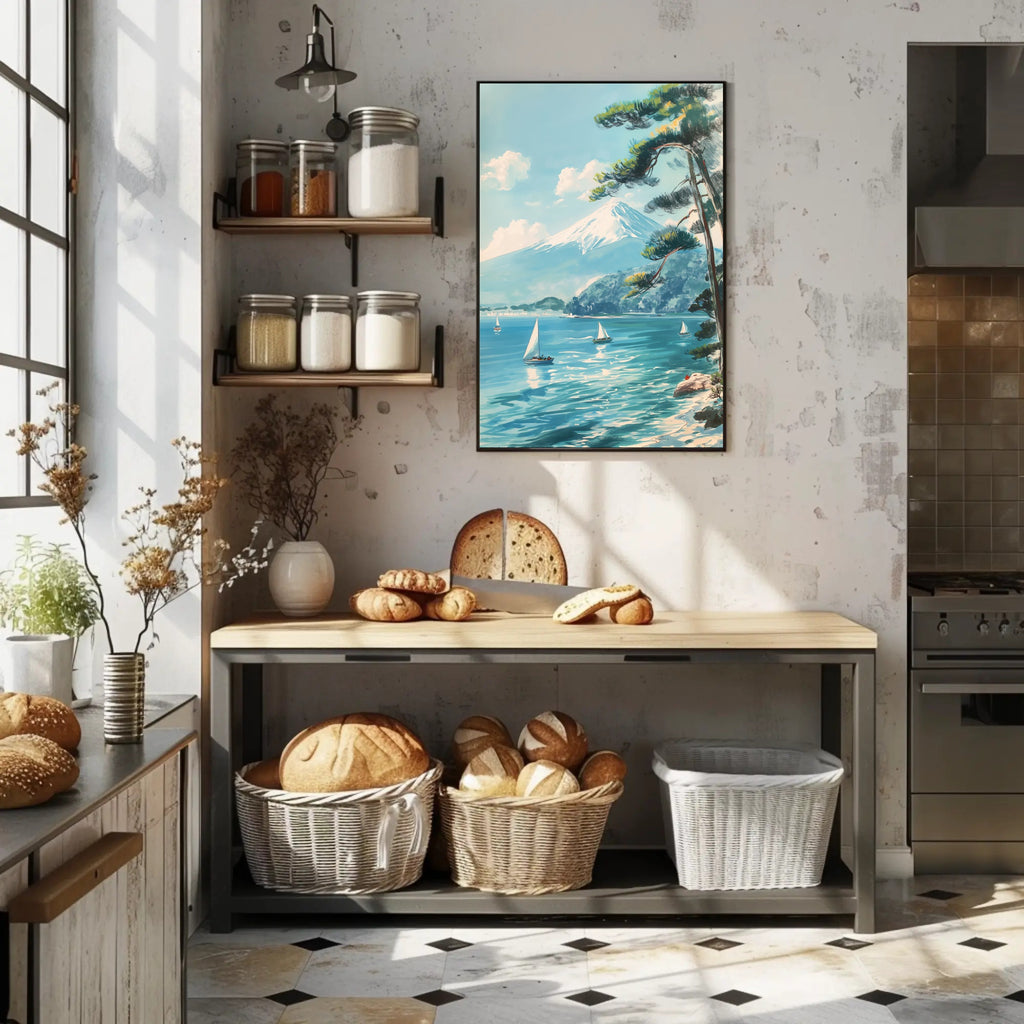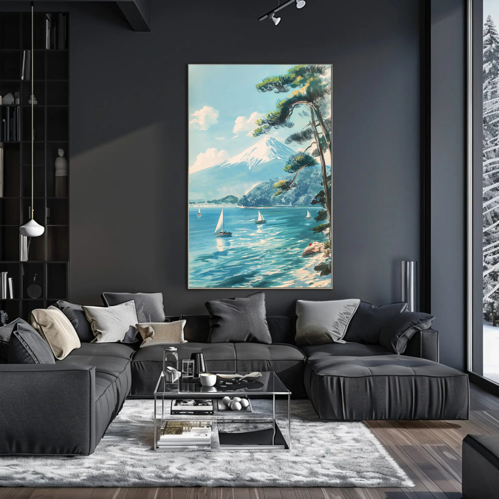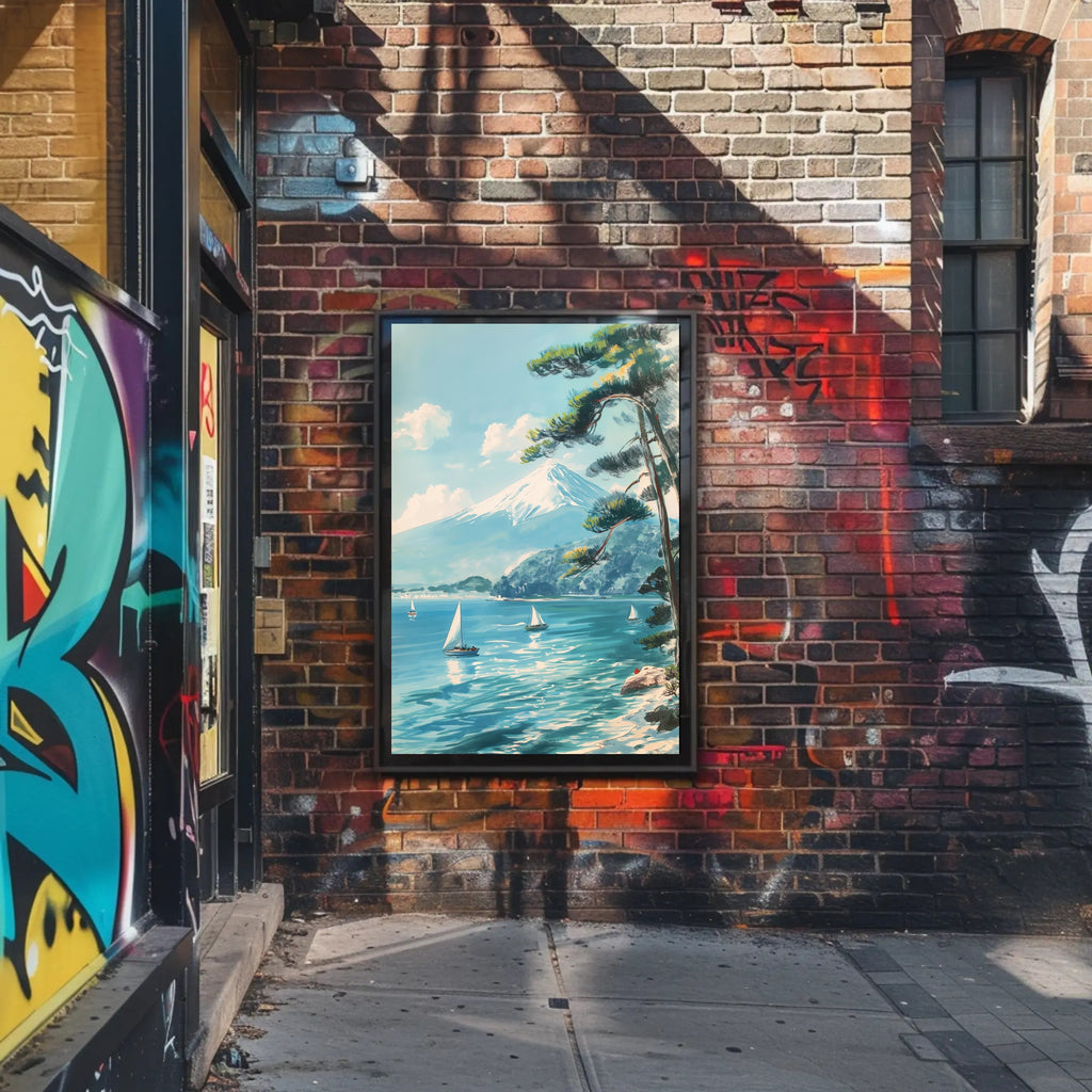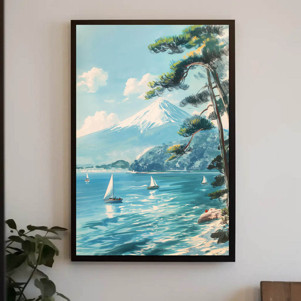 Transport your space to a calm seaside morning with the Scenic Tranquil Lake and Mountain Travel Poster from PosterGoat. This mid-century modern, vintage-style print captures a snow-capped mountain reminiscent of Mount Fuji rising above an idyllic lake, where graceful white sailboats glide across shimmering turquoise water beneath a clear blue sky. Hand-painted brush textures, a leaning pine tree framing the right side, and reflective water highlights create a serene, wanderlust-inspiring scene perfect for any room.
