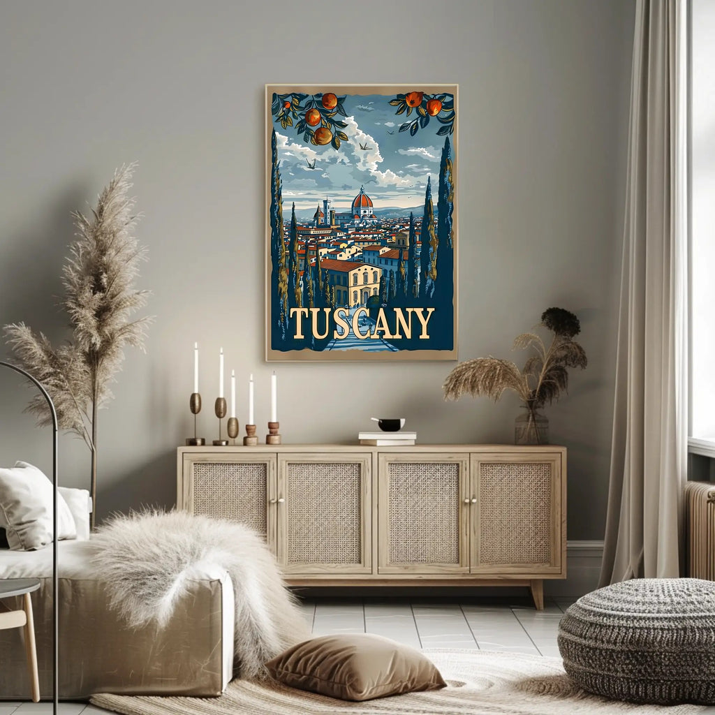 Bring the timeless charm of Italy into your home with the "Scenic Tuscany: A Panoramic View of Tradition and Nature" poster from PosterGoat. This vibrant illustration celebrates Tuscany's iconic skyline — a sweeping panoramic cityscape anchored by a majestic cathedral dome, layers of red-tiled roofs, slender cypress silhouettes and playful orange branches framing the sky.