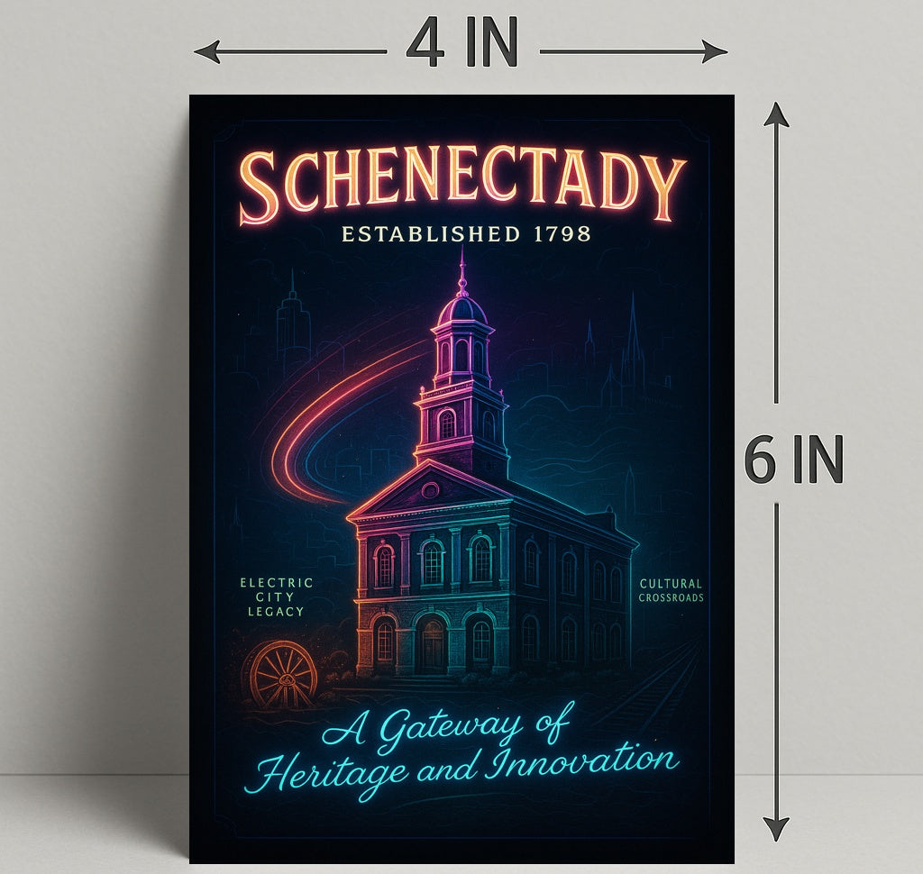 Capture the soul of upstate New York with the Schenectady: A Gateway of Heritage and Innovation poster from PosterGoat. This luminous art print combines nostalgic architecture and modern neon-style accents to celebrate Schenectady’s "Established 1798" legacy — a striking focal point for living rooms, offices, or hallways.