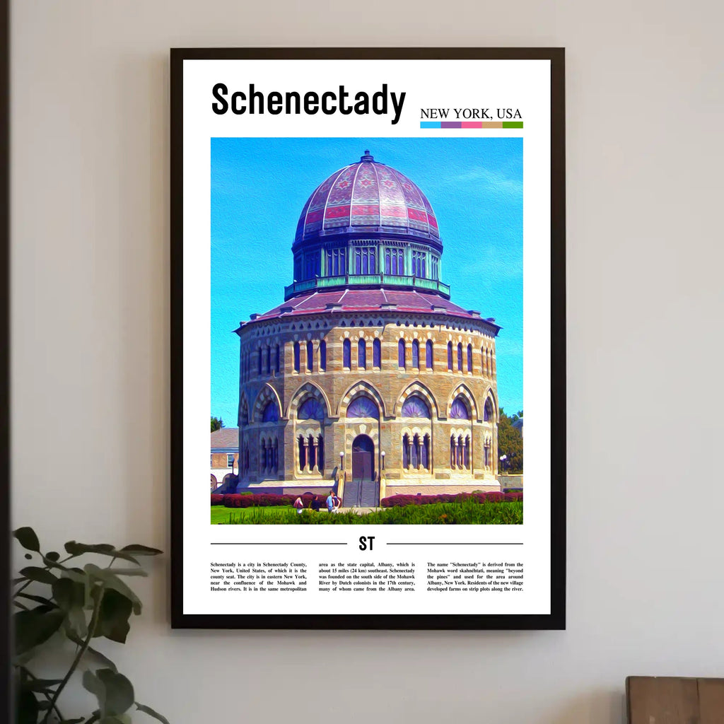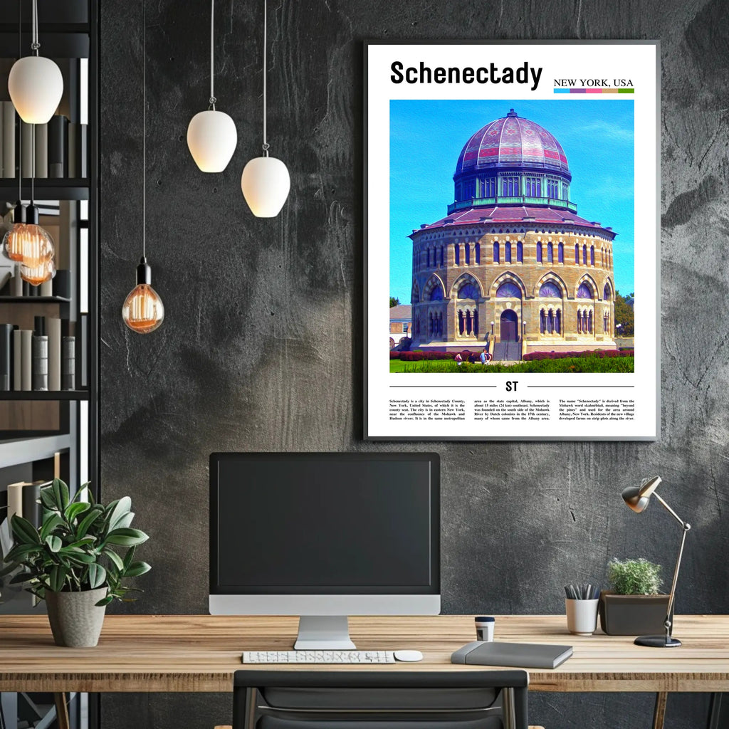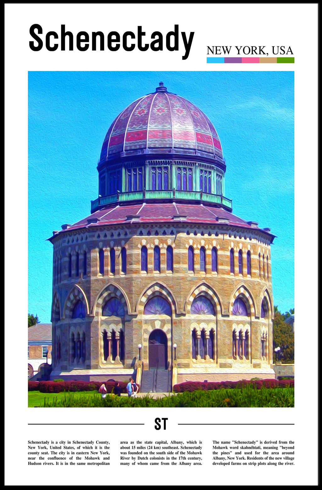 Celebrate Schenectady’s architectural heritage with this striking travel poster from PosterGoat. Featuring the city’s iconic domed landmark rendered in vivid, painterly colors and set inside a clean white border with bold "Schenectady" typography, this print blends vintage travel-poster charm with minimalist modern design.