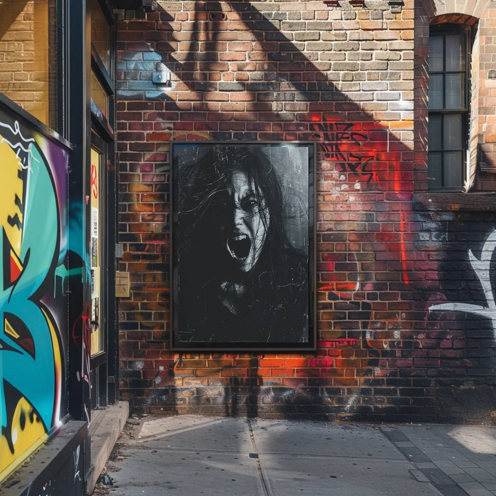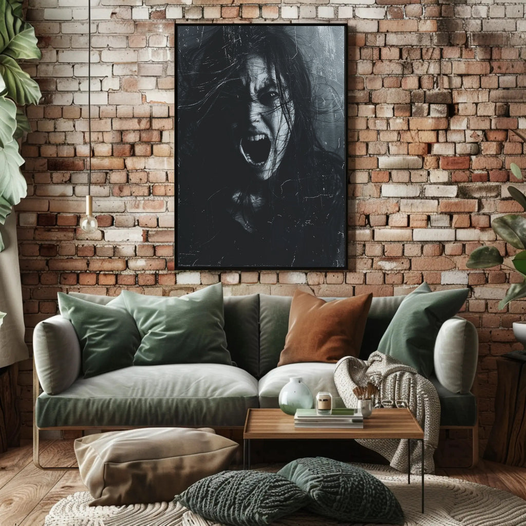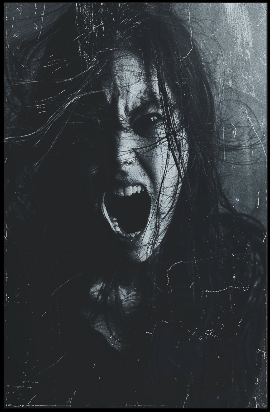 Scream in the Shadows Art Print Poster Decor from PosterGoat delivers a powerful, cinematic statement piece that commands attention. This high-contrast, monochrome art print captures a raw, emotive scream framed by turbulent hair and deep, dramatic shadows — a bold addition to any modern home or creative space.