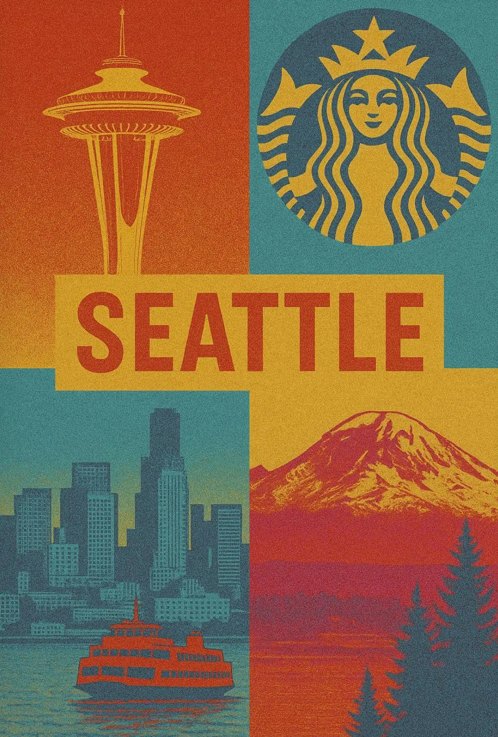 - Iconic imagery: Stylized representations of Seattle landmarks and the familiar coffee siren emblem create instant recognition and local pride.