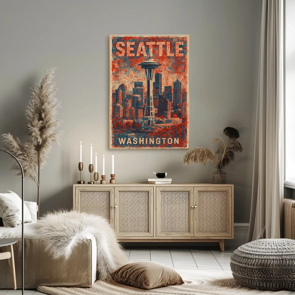 Celebrate the beauty of this iconic cityscape with a timeless wall art piece. This poster centers on the Space Needle amid a charming Seattle skyline, blending abstraction with the classic feel of vintage travel posters. Its bold red and blue tones evoke a retro, patriotic vibe, making it a standout addition for collectors, enthusiasts, or anyone who wants to bring meaning and inspiration into their space.