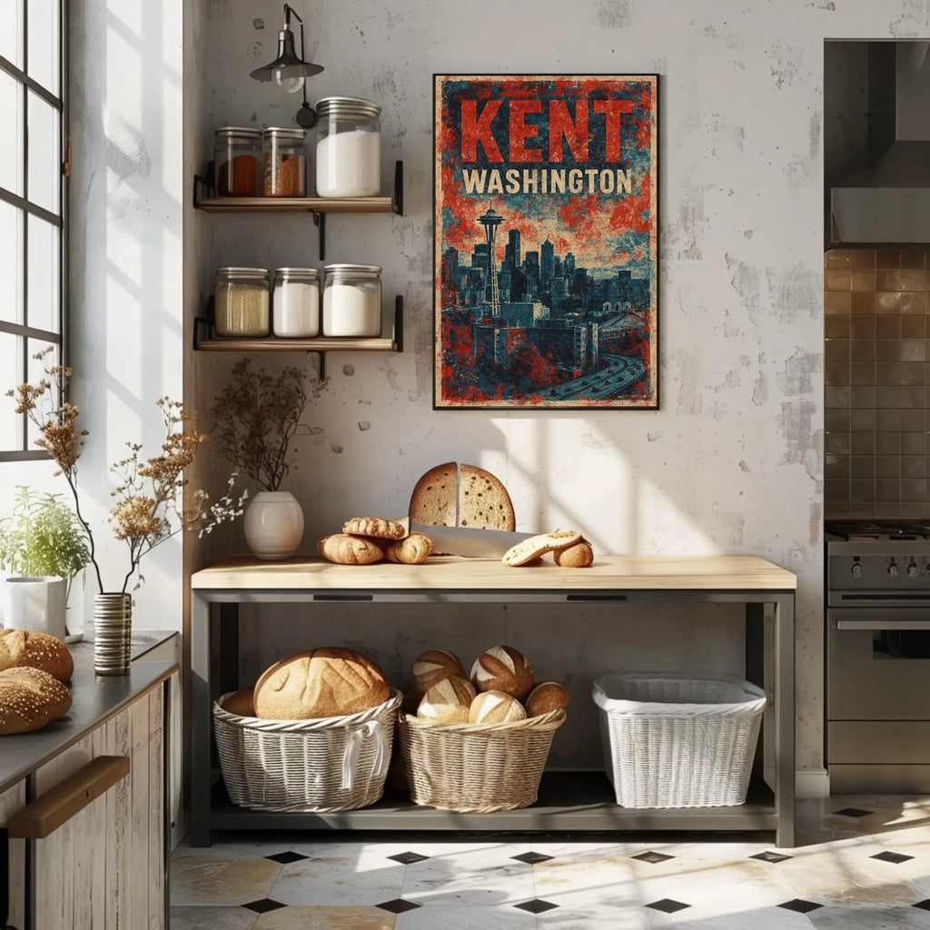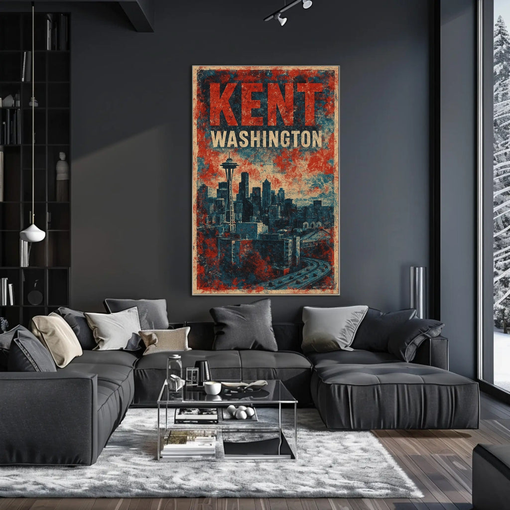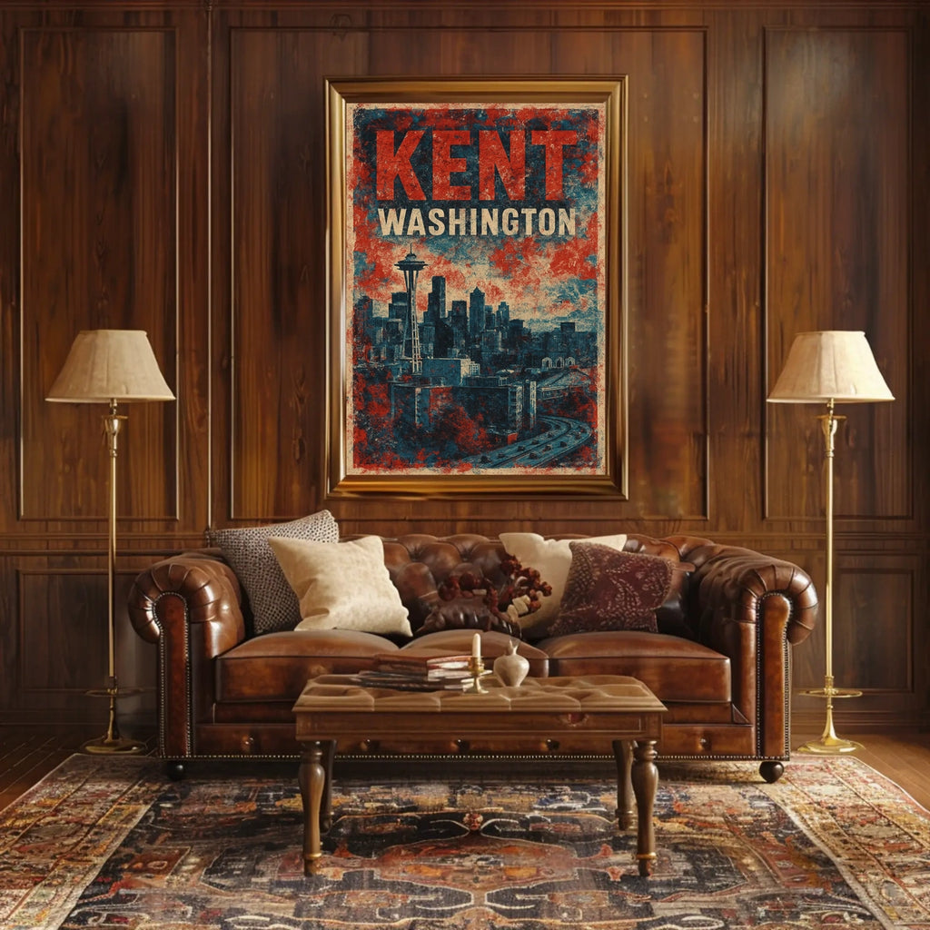 This vintage poster showcases the breathtaking skyline of Seattle, Washington, with the Space Needle taking center stage. Designed with a distressed texture, it provides a weathered, classic look that exudes a bold sense of nostalgia and pride associated with the Pacific Northwest. The color palette of red, blue, and beige further accentuates its patriotic theme, making it a striking addition to any room. Although Kent Washington is mentioned, the main focus remains on Seattle's iconic architecture. Perfect for urban enthusiasts and Seattle admirers, this design captures the city's vibrant spirit. Perfect for Seattle home decor, offices, or classroom displays, it blends retro charm with display-ready quality.