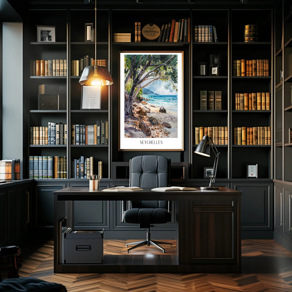 Bring the calm of an island escape into your home with the Secluded Seychelles Beach Scenery Travel Poster by PosterGoat. Rendered in delicate watercolor, this travel-style poster captures a tranquil shoreline framed by twisting tree branches, smooth granite boulders, and lush tropical foliage, with misty hills melting into an azure Indian Ocean under a clear sky.